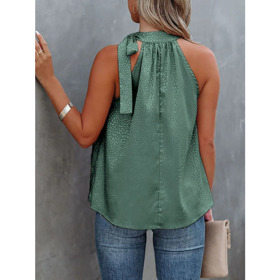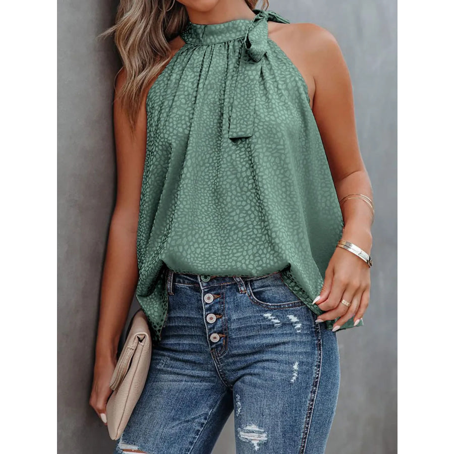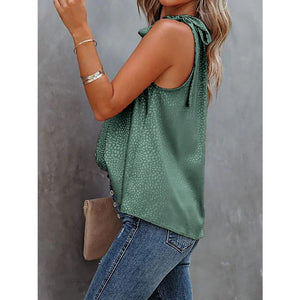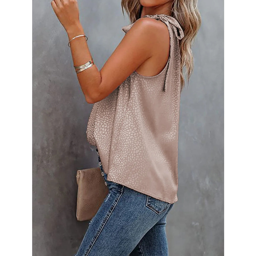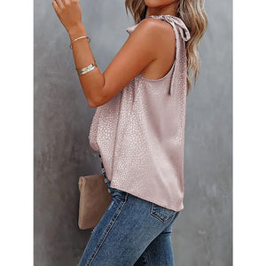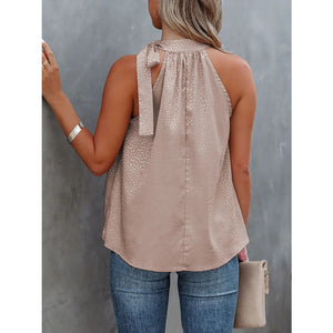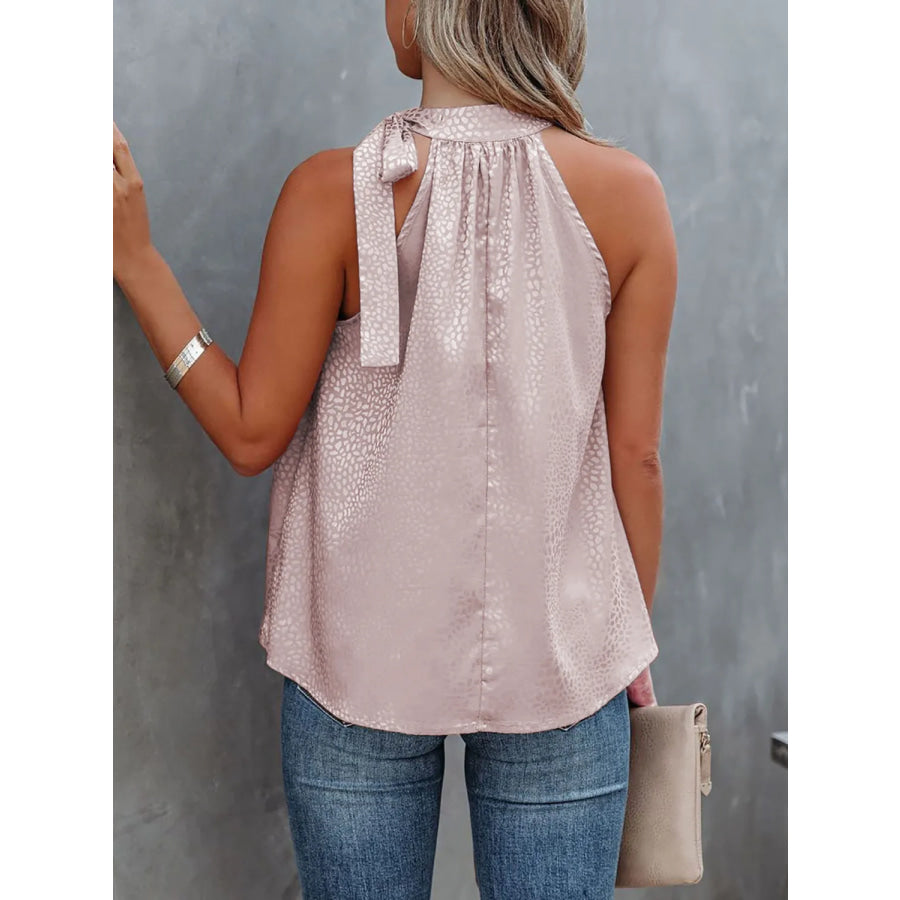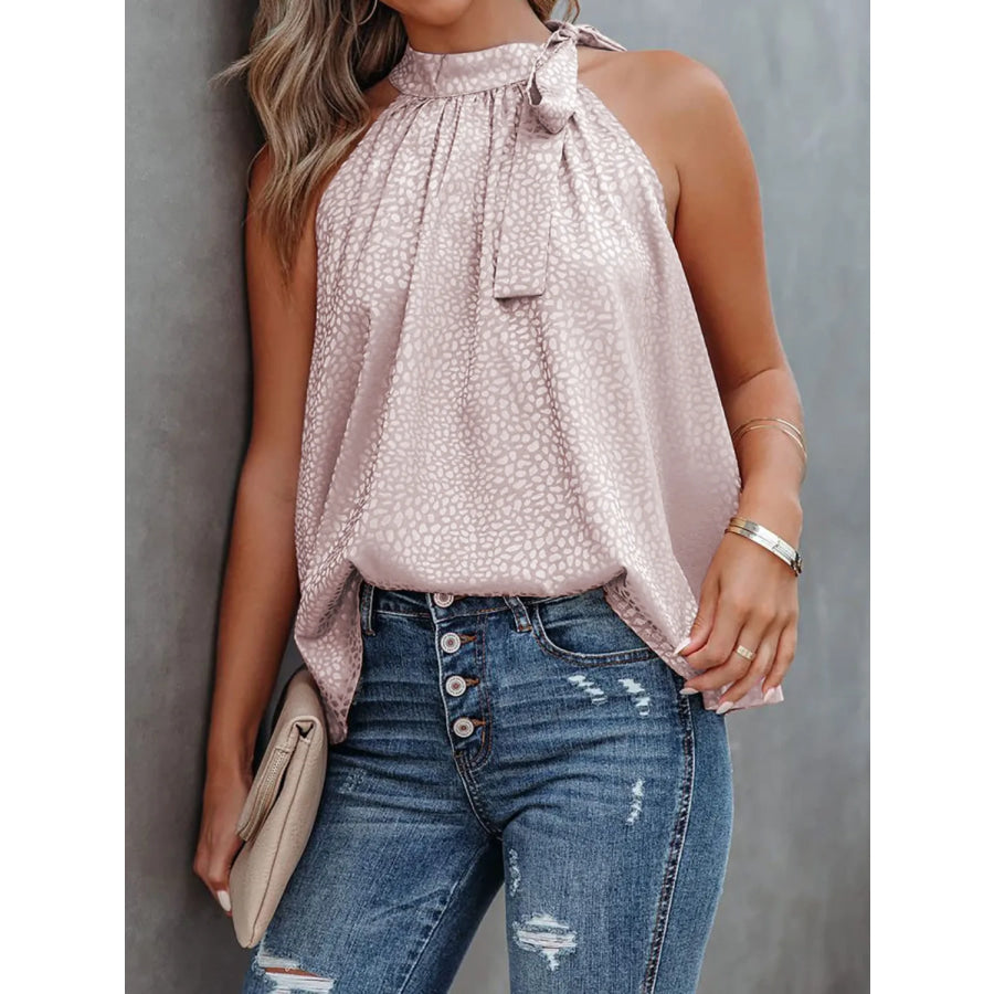 This sophisticated cami top features a beautiful spotted print on a luxurious, flowing fabric. The halter neckline with tie detail adds an elegant touch, while the gathered design creates a flattering silhouette. Made from soft, lightweight material perfect for warm weather wear. The versatile blush pink color pairs easily with both casual and dressy pieces. Ideal for layering or wearing alone, this piece transitions seamlessly from day to night. The relaxed fit and quality construction ensure both style and comfort.