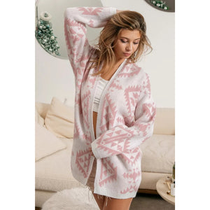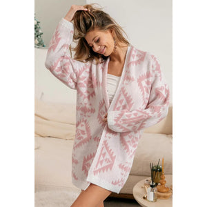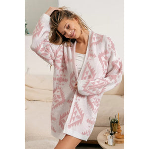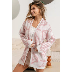 The Aztec pattern open front cardigan is a stylish and cozy addition to your fall wardrobe. The Aztec pattern adds a bohemian and unique touch to the cardigan. The open front design makes it easy to layer over your favorite tops. This cardigan is perfect for adding a pop of color and pattern to your outfit. Pair it with jeans and boots for a chic and comfortable look for cooler days.
