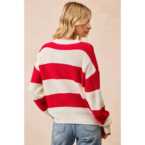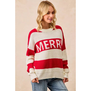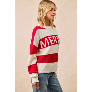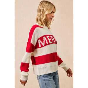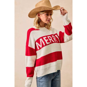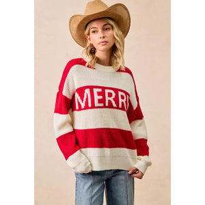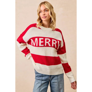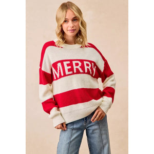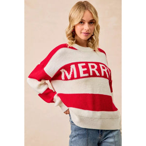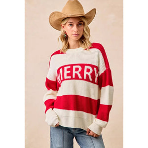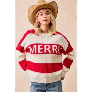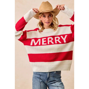 This festive pullover sweater features a bold MERRY text graphic across the chest, showcasing classic holiday spirit with vibrant red and cream white horizontal stripes. Crafted from soft ribbed knit material, this oversized sweater offers ultimate comfort and warmth for the winter season. The relaxed fit design makes it perfect for casual holiday gatherings, Christmas parties, or everyday festive wear. The premium knit construction ensures durability while maintaining a cozy feel. Ideal for layering or wearing alone, this statement piece combines holiday cheer with contemporary fashion styling.