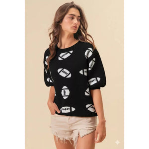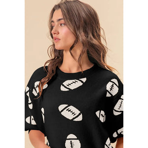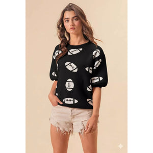 This stylish football print pullover sweater features a comfortable knit construction with an all-over football pattern on a classic black background. The relaxed fit design offers excellent comfort and mobility, while the round neckline and short sleeves provide a casual, sporty aesthetic. Made from soft, breathable fabric that's perfect for everyday wear, this pullover combines athletic-inspired style with feminine comfort. The eye-catching football motifs make it ideal for game day, casual outings, or showing team spirit. Easy care and versatile styling options make this pullover a must-have addition to any sports enthusiast's wardrobe.