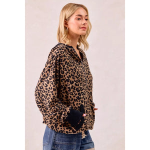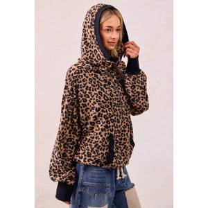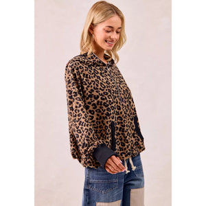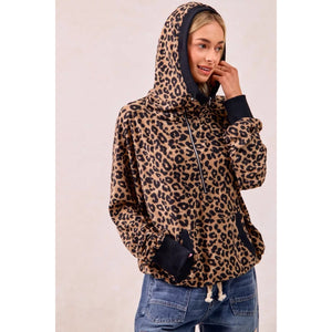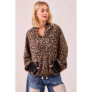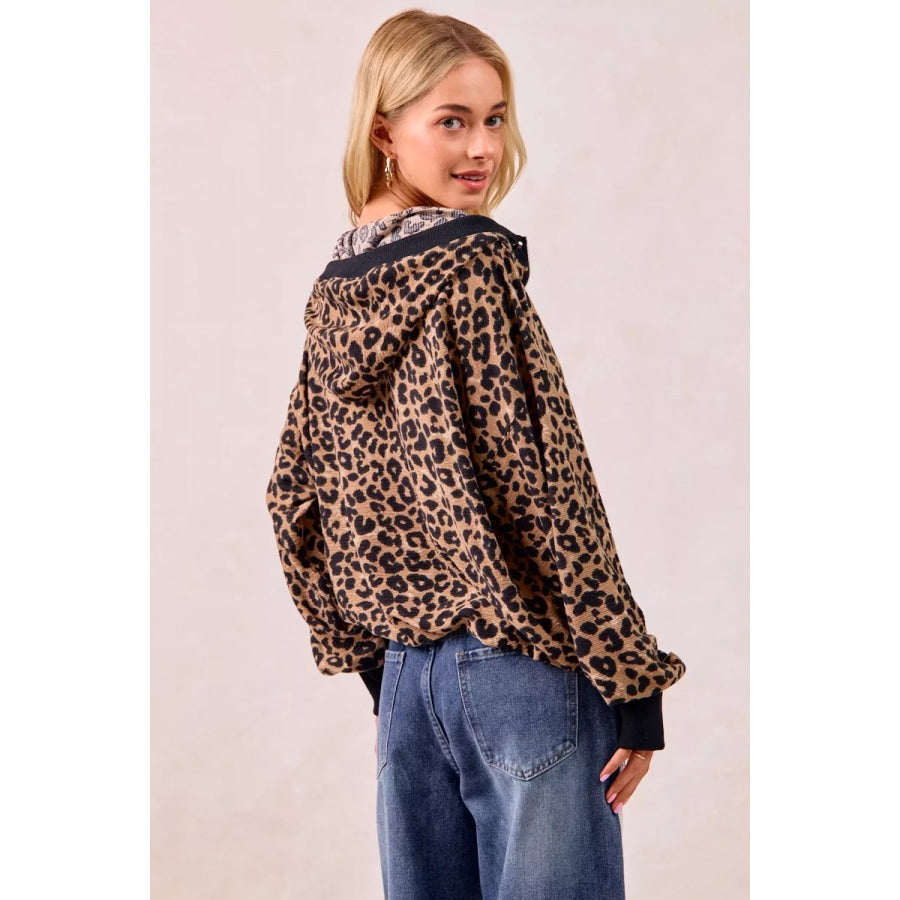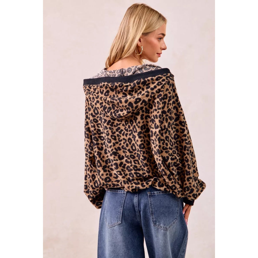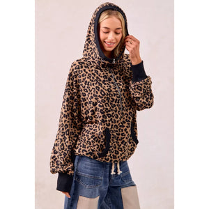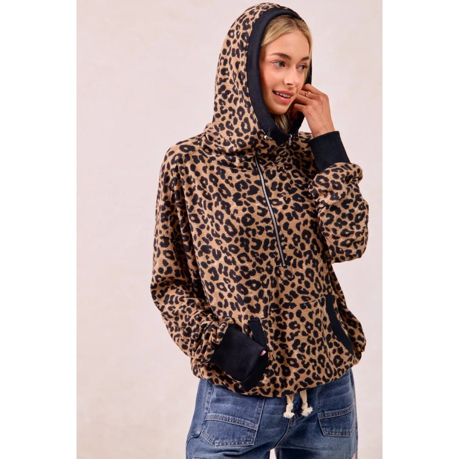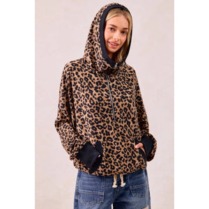 BiBi Leopard Print Waffle Half Zip Up Hoodie W Pocket