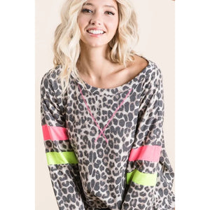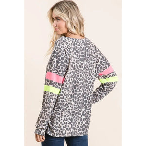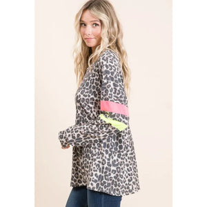 The leopard thermal top with contrast color block is a trendy and bold addition to your wardrobe. The leopard print adds a touch of wild style to the cozy thermal fabric. The contrast color block detail creates a striking and eye-catching look. Perfect for adding some edge to your outfit, this top is versatile and on-trend. Elevate your fashion game with this chic and statement-making top that combines comfort with a fierce attitude.