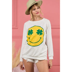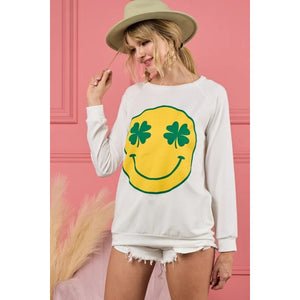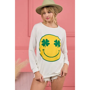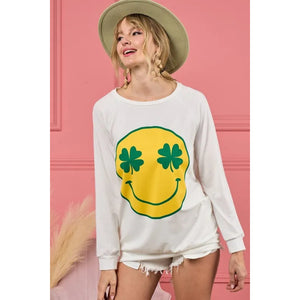 This round neck long sleeve top features a smiley face graphic for a fun and playful touch. Perfect for adding a cheerful and lighthearted element to your outfit. The graphic design adds a trendy and expressive look to the top. The long sleeves provide comfort and coverage for cooler days. Elevate your casual style with this cute and whimsical smiley face top.