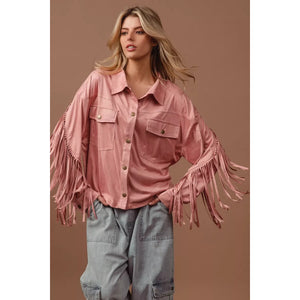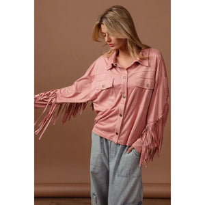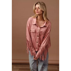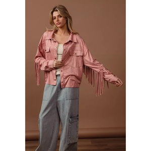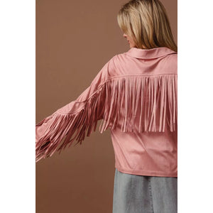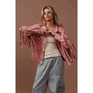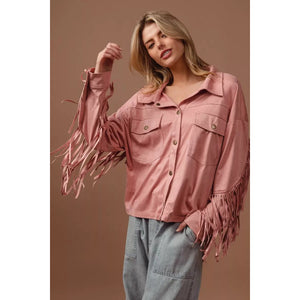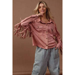 The suede fringe long sleeve jacket is a stylish and bohemian-inspired outerwear piece. The suede material adds a touch of luxury and texture to the jacket. With fringed details, this jacket exudes a fun and playful vibe. Perfect for adding a Western or vintage flair to your look, this jacket is versatile and chic. Elevate your outfit with this trendy and statement-making jacket that showcases a unique and fashionable style.