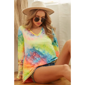 Embrace a laid-back and trendy style with this Tie Dye Long Sleeve V-Neck T-Shirt. The tie-dye print adds a fun and colorful touch to your outfit, making it perfect for a relaxed and casual look. The V-neck design offers a flattering neckline that elongates the upper body. With long sleeves, this shirt is great for cooler weather while still maintaining a stylish and effortless vibe. Pair this t-shirt with your favorite jeans or shorts for a fashionable and comfortable ensemble that exudes a cool and carefree attitude.