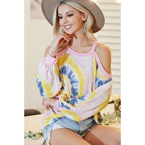 BiBi Tie Dye Print Terry Top with Cold Shoulder Detail