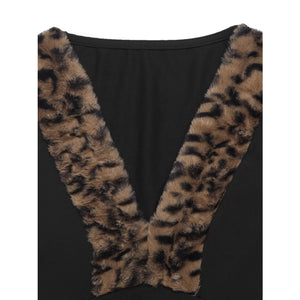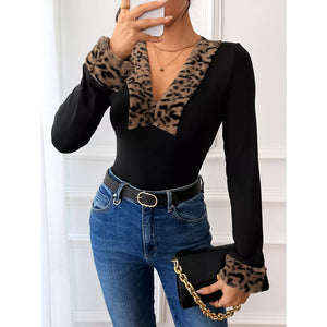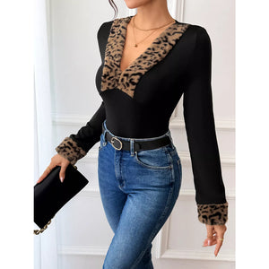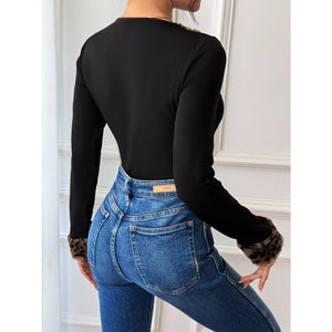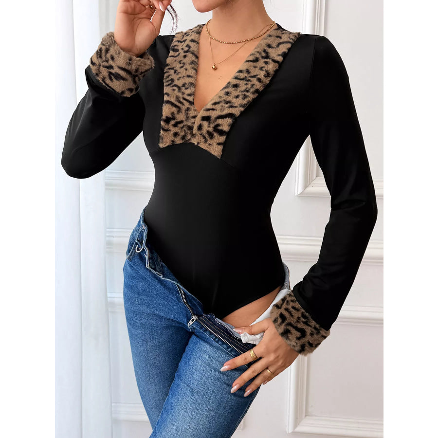 Leopard Trim V-Neck Long Sleeve Bodysuit