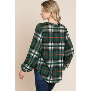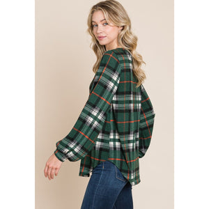 BOMBOM Curved Hem Plaid Round Neck Long Sleeve Top