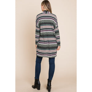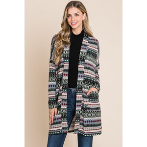 BOMBOM Geometric Open Front Long Sleeve Cardigan with Pockets