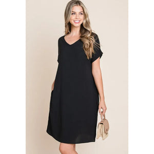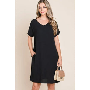 This V-neck short sleeve dress with pockets is a versatile and stylish addition to your wardrobe. The V-neck design adds a touch of femininity, while the inclusion of pockets offers both convenience and practicality. Perfect for various occasions, this dress combines fashion and functionality for a chic and effortless look.