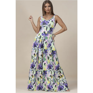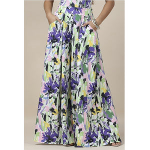 Custom flower print with low waist, pocket and zipper detail flare full size palazzo pants. Model wears S. Model: 5'5 36-24-39. Made in USA.