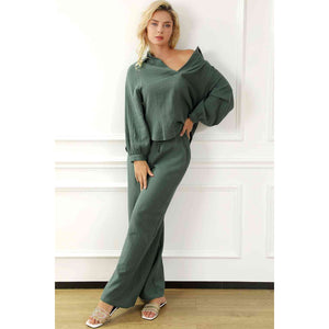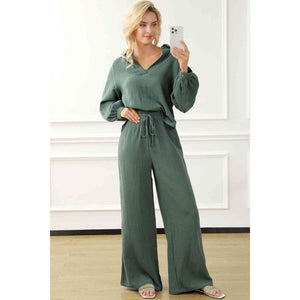 Collared Neck Top and Drawstring Pants Set