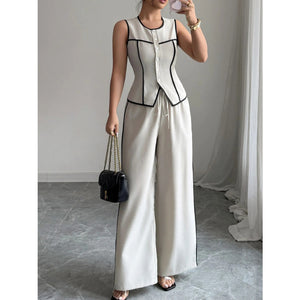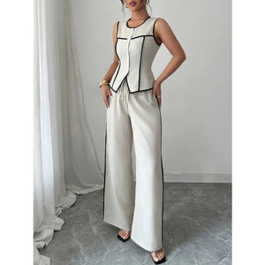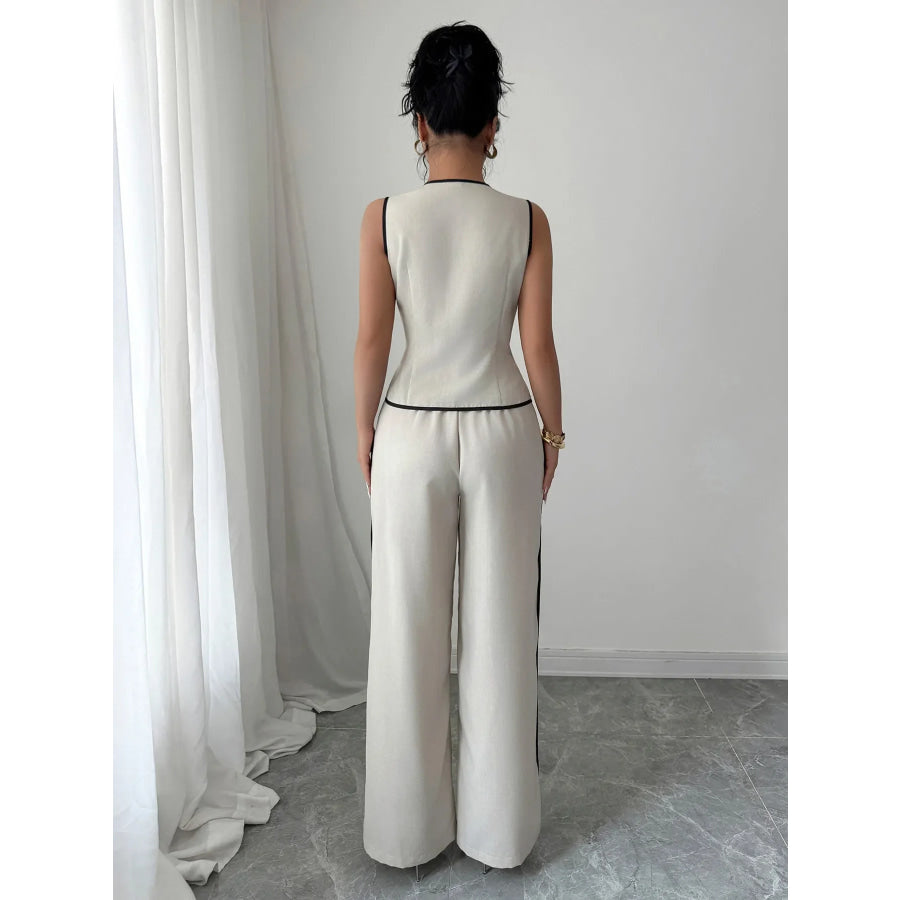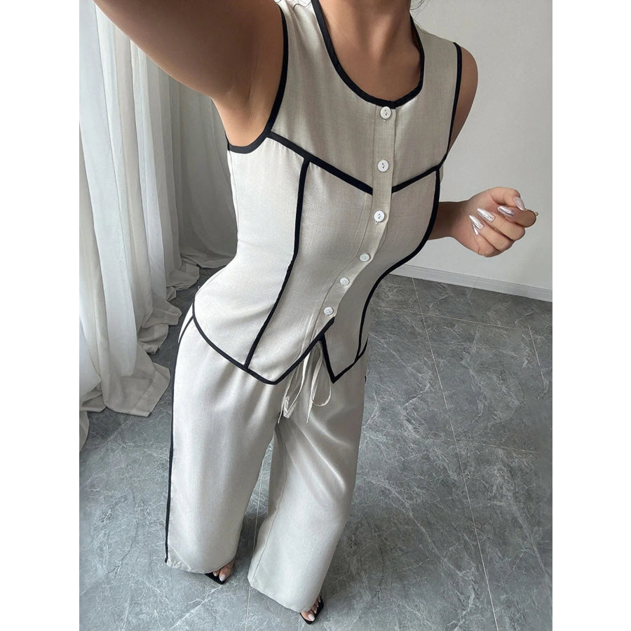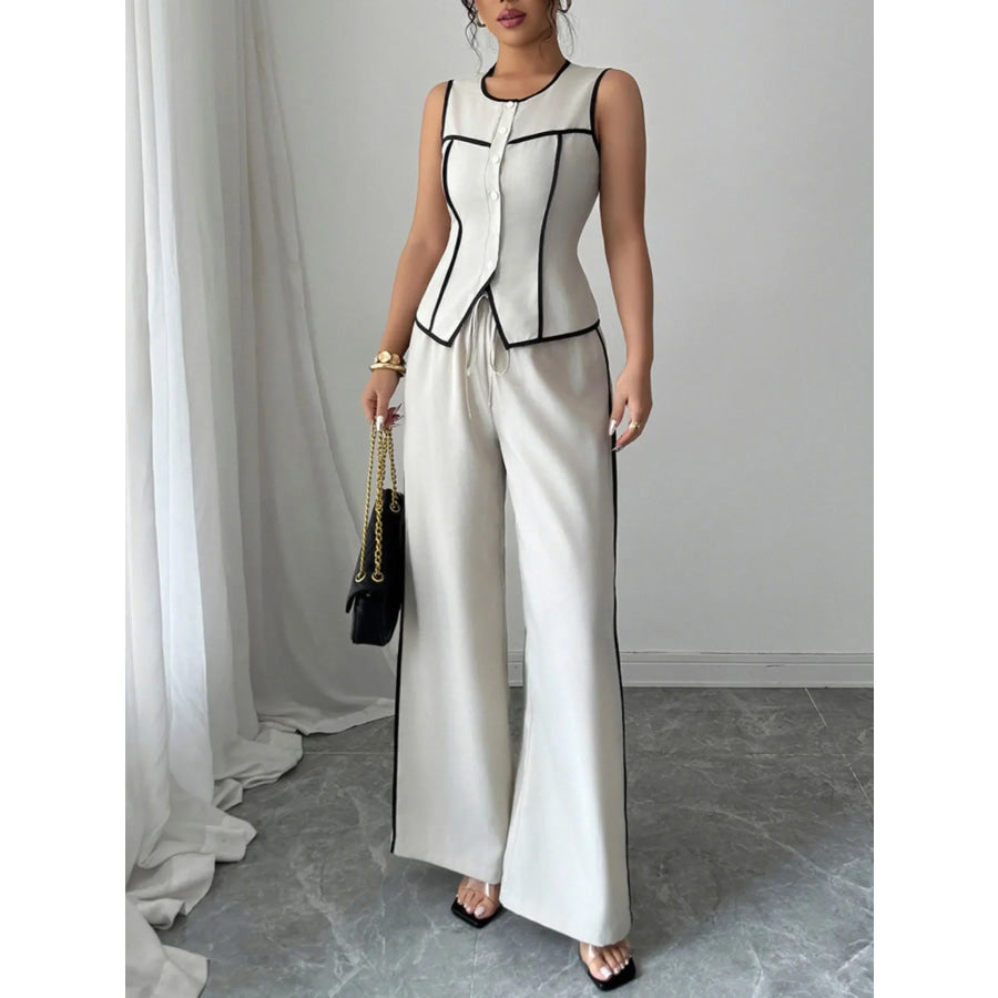 Contrast Piping Round Neck Top and Wide-Leg Pants Set