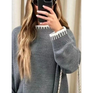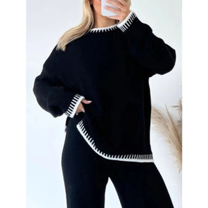 This stylish black sweater set features a round neck top with contrasting white trim details and matching wide-leg pants. Made from soft knitted material, the set offers ultimate comfort with its relaxed oversized fit. The top showcases decorative white edging on the neckline and hem, while the high-waisted pants provide a flattering silhouette. Perfect for casual outings, lounging, or creating an effortlessly chic look. The coordinated two-piece design ensures a put-together appearance with minimal effort, making it ideal for modern women seeking both comfort and style.
