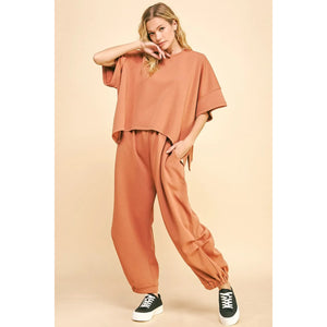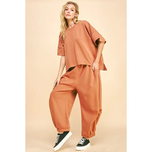 This set features a flowy top and elastic waistband pants for a comfortable and stylish ensemble. The flowy top drapes beautifully, creating a flattering silhouette. The elastic waistband on the pants ensures a comfortable fit and ease of movement. Perfect for a casual day out or lounging at home, this set offers both comfort and style in one coordinated look.