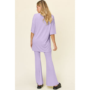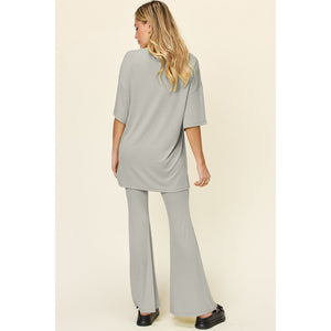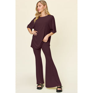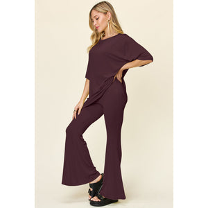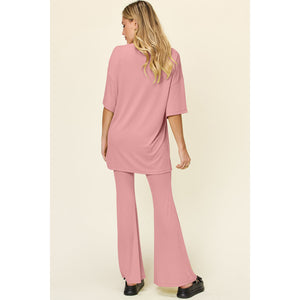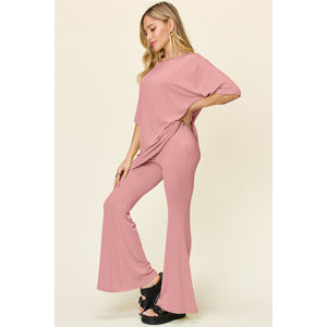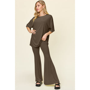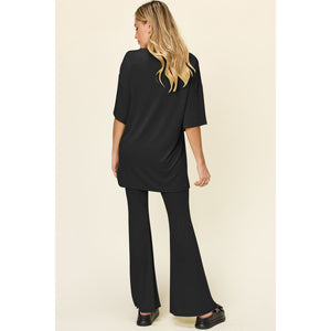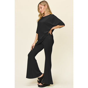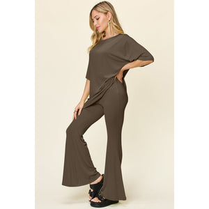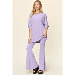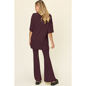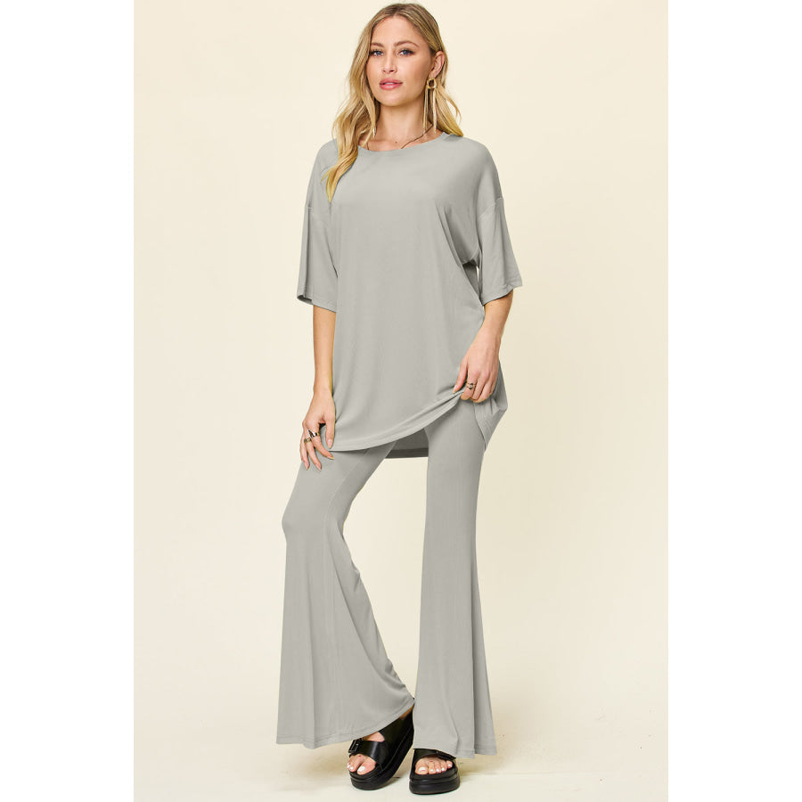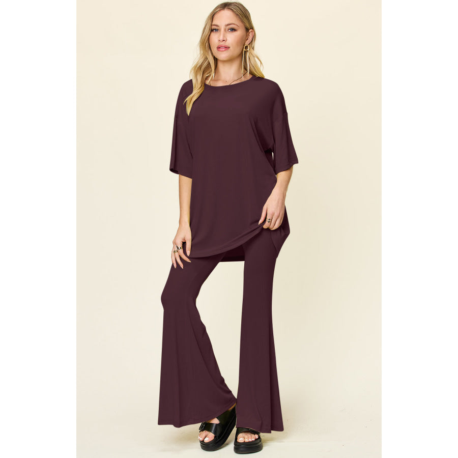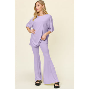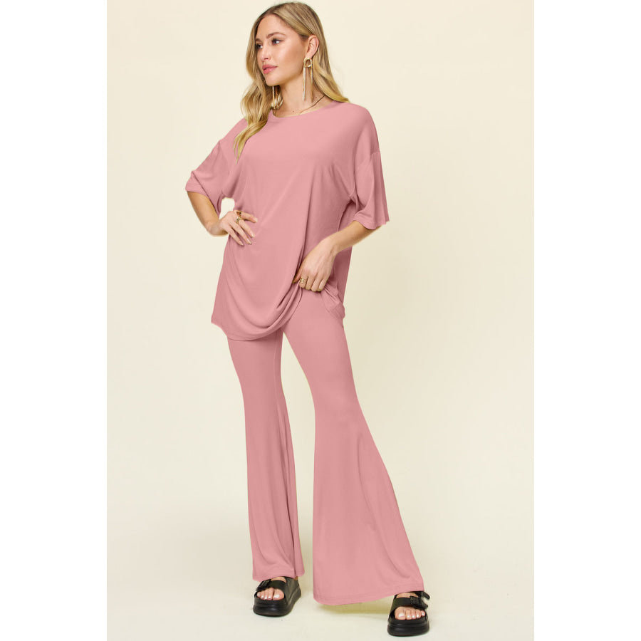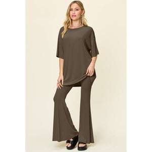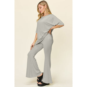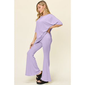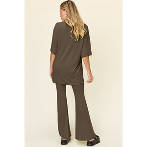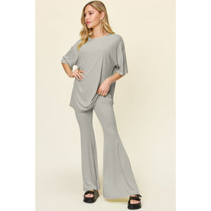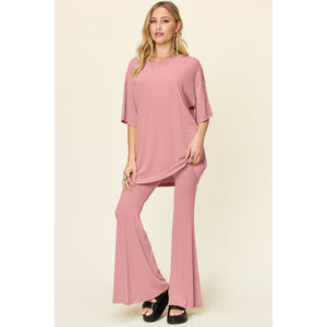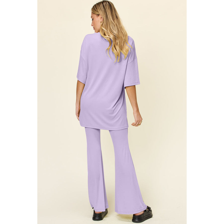 Double Take Full Size Round Neck Drop Shoulder T-Shirt and Flare Pants Set