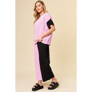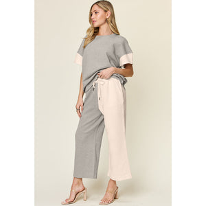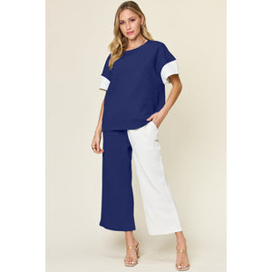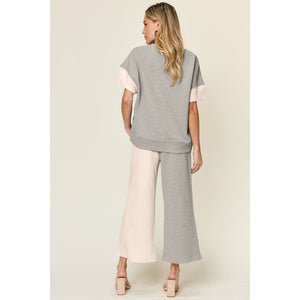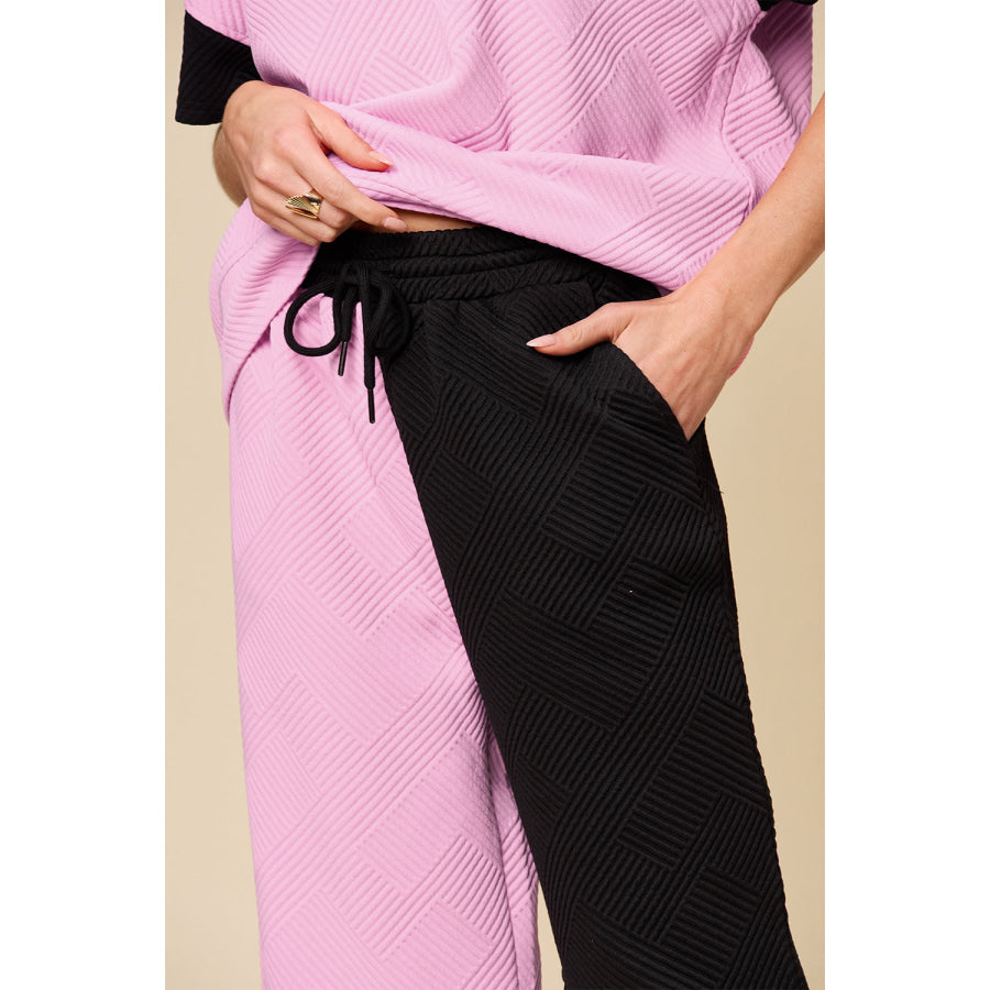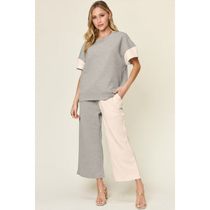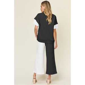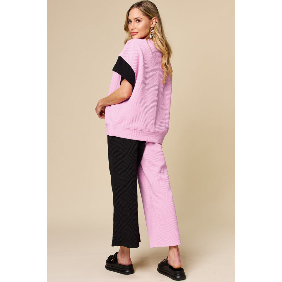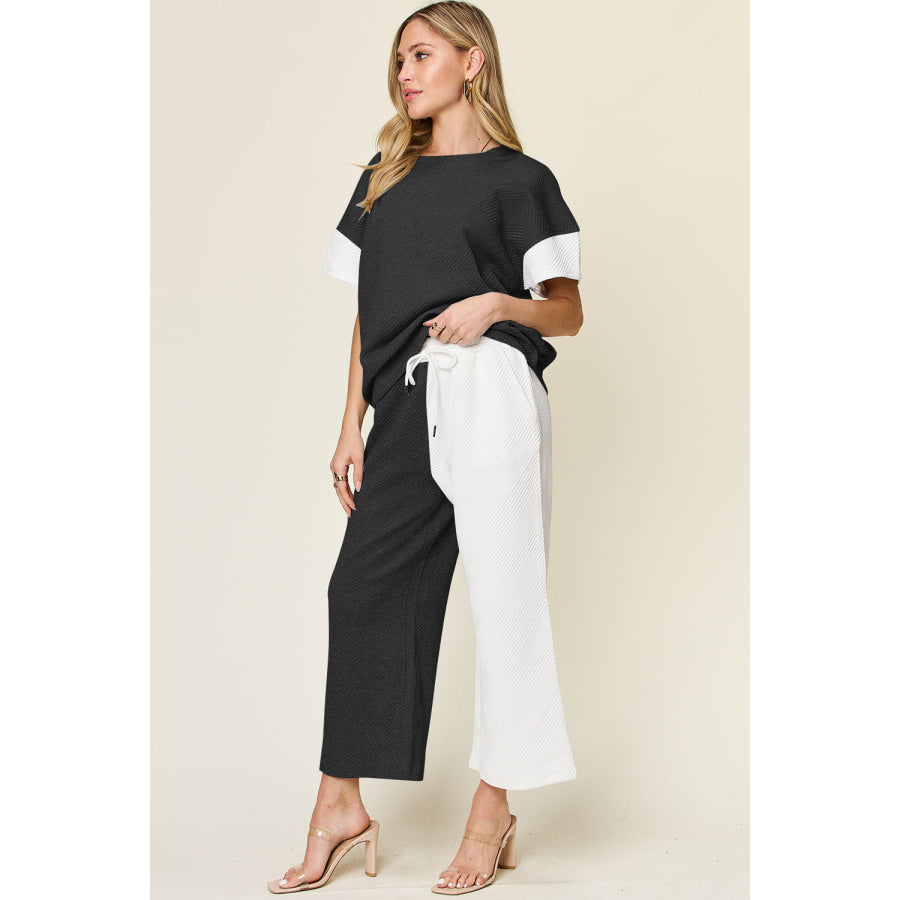 Double Take Full Size Texture Contrast T-Shirt and Wide Leg Pants Set