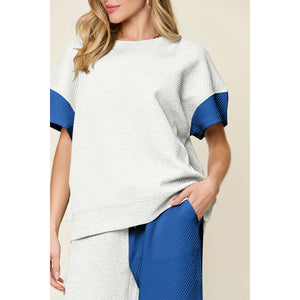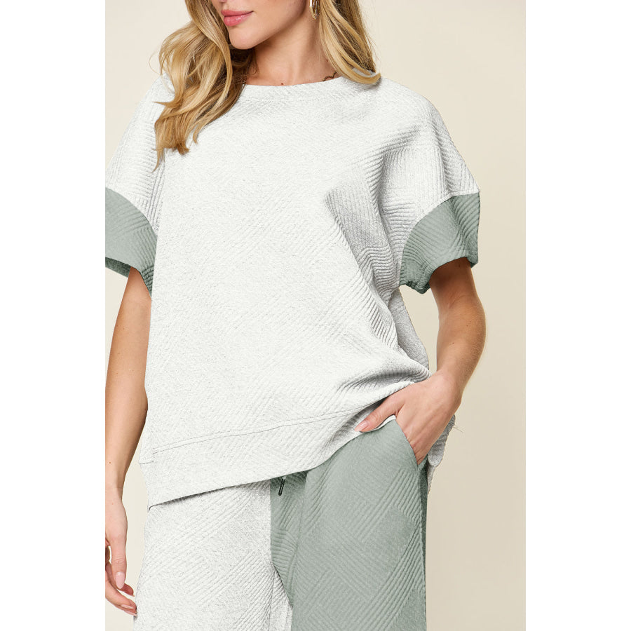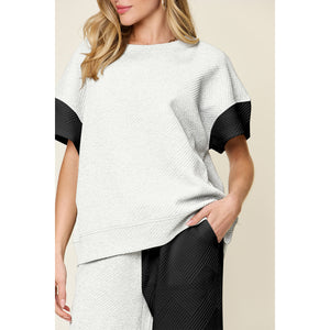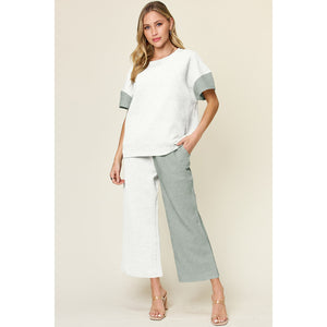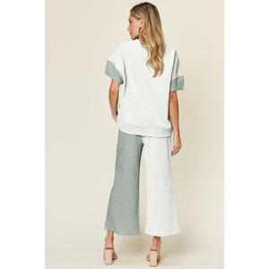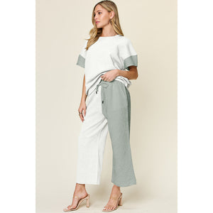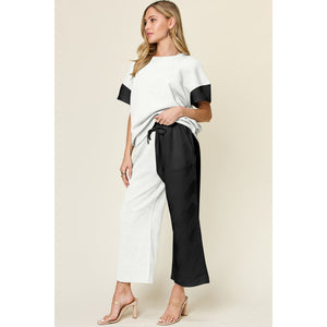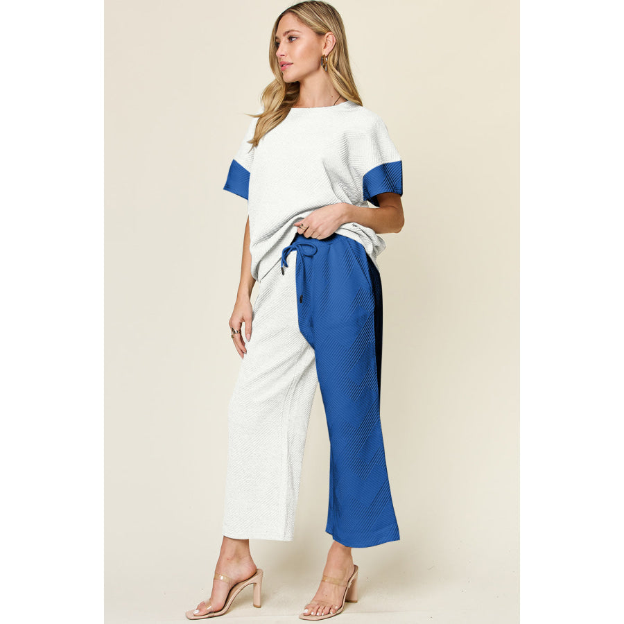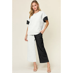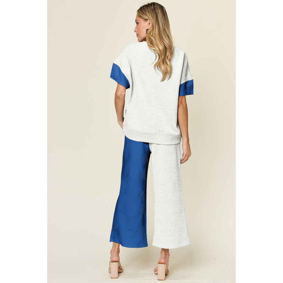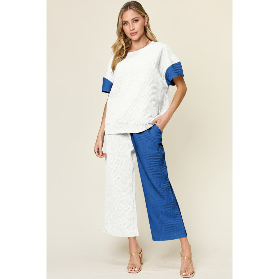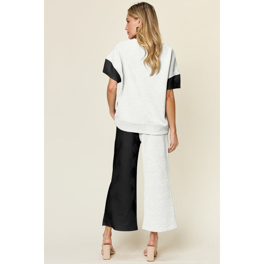 Double Take Full Size Texture Contrast T-Shirt and Wide Leg Pants Set