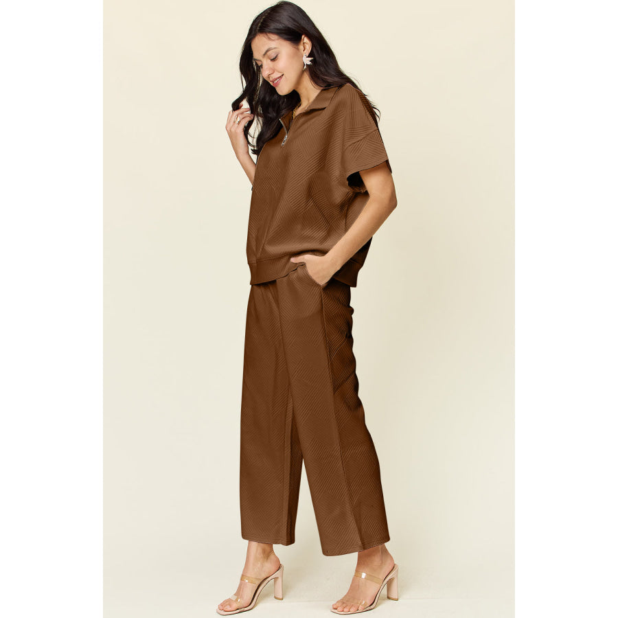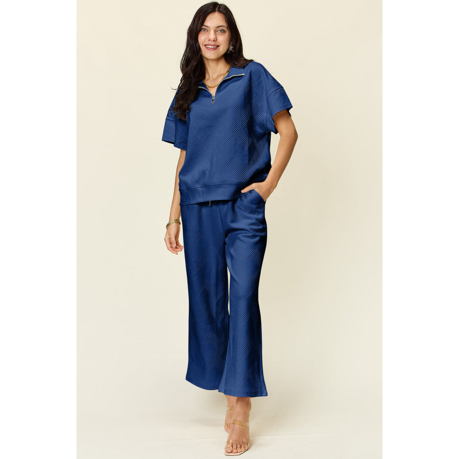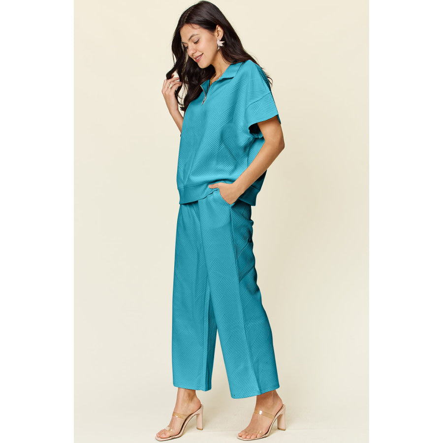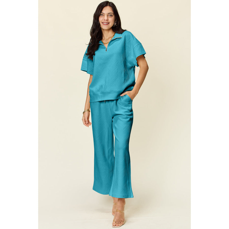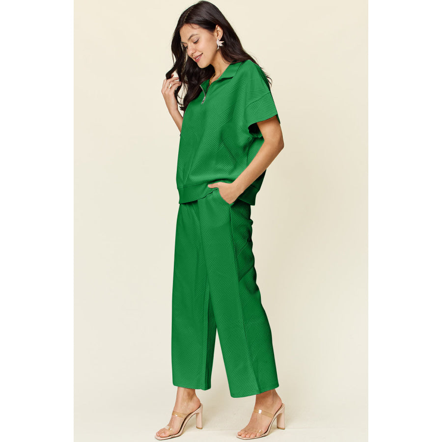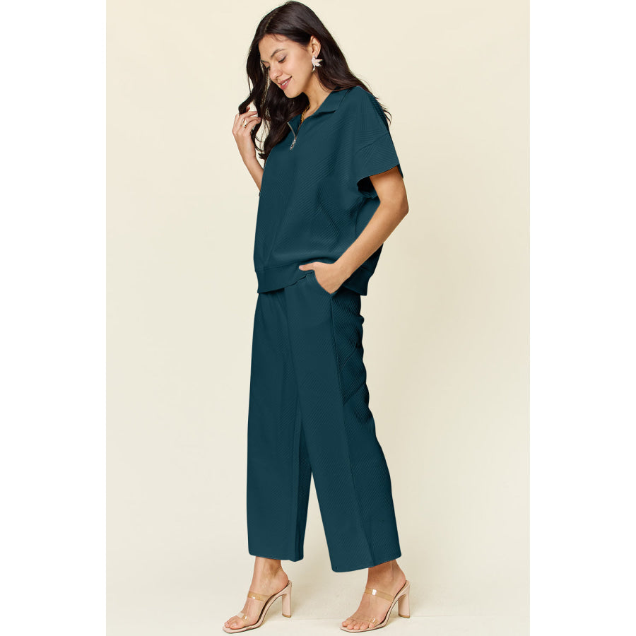 Double Take Full Size Texture Half Zip Short Sleeve Top and Pants Set
