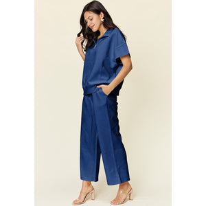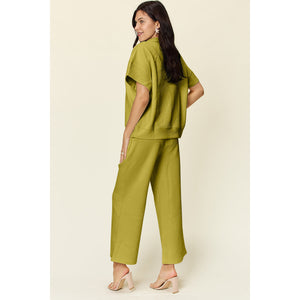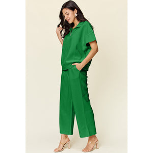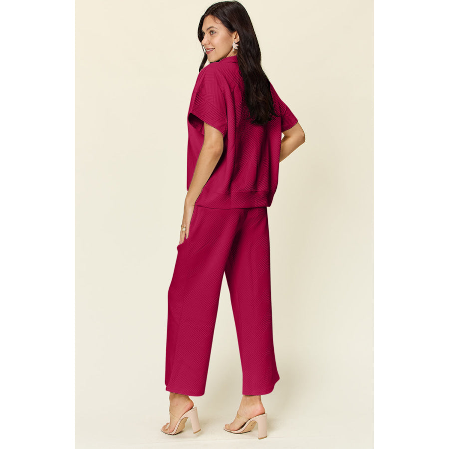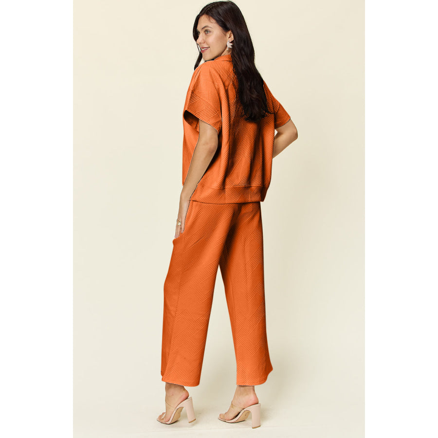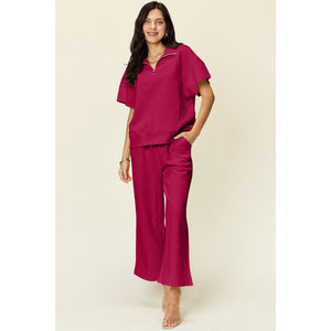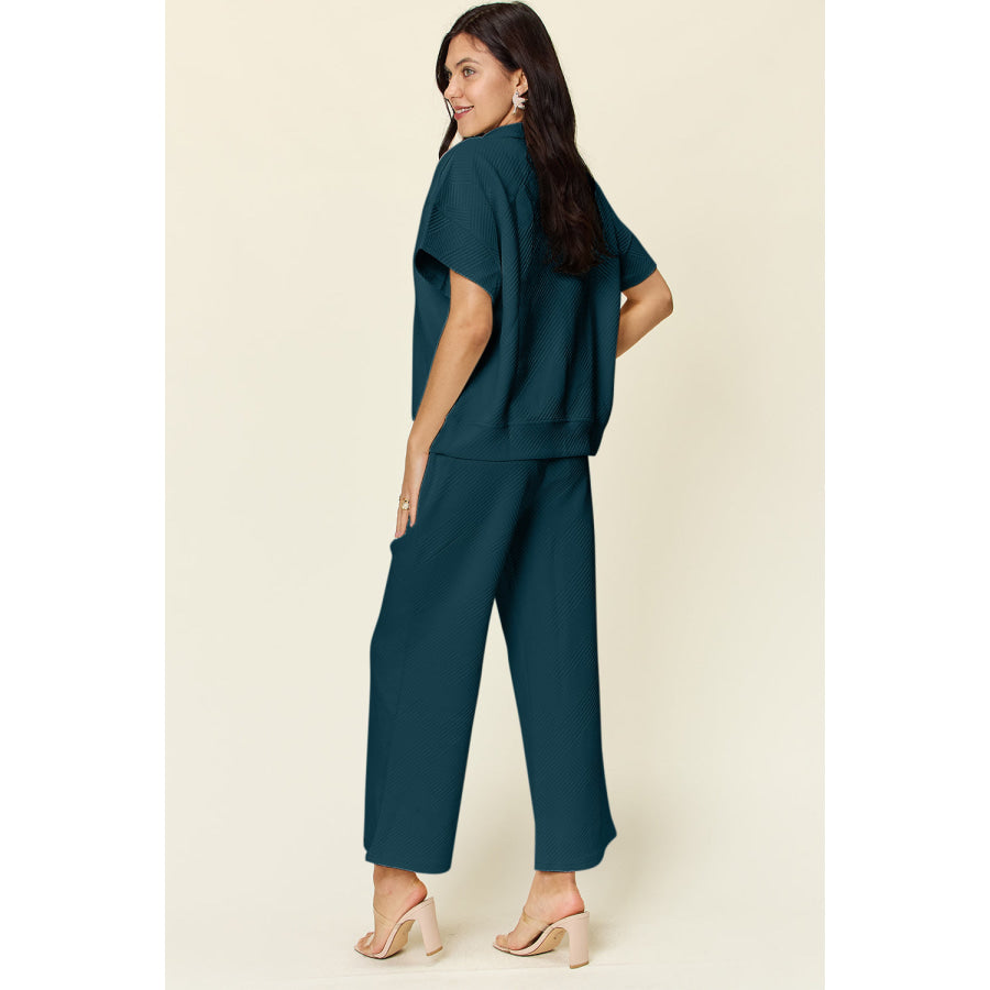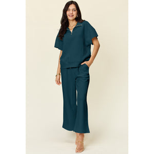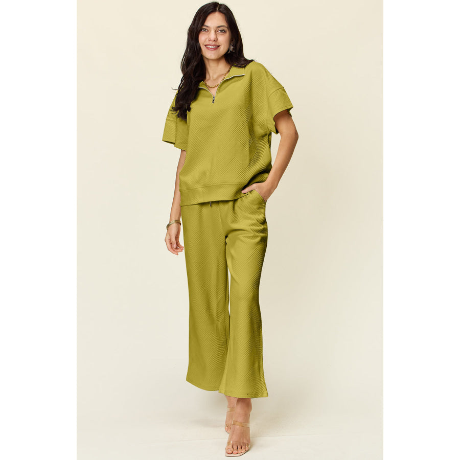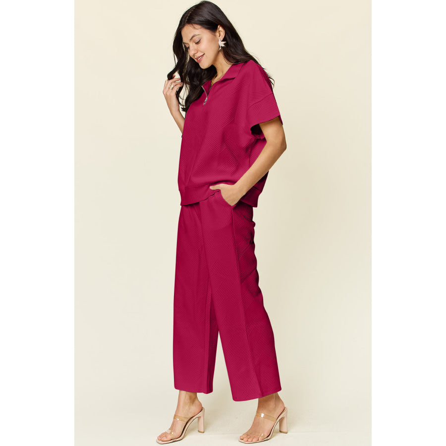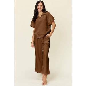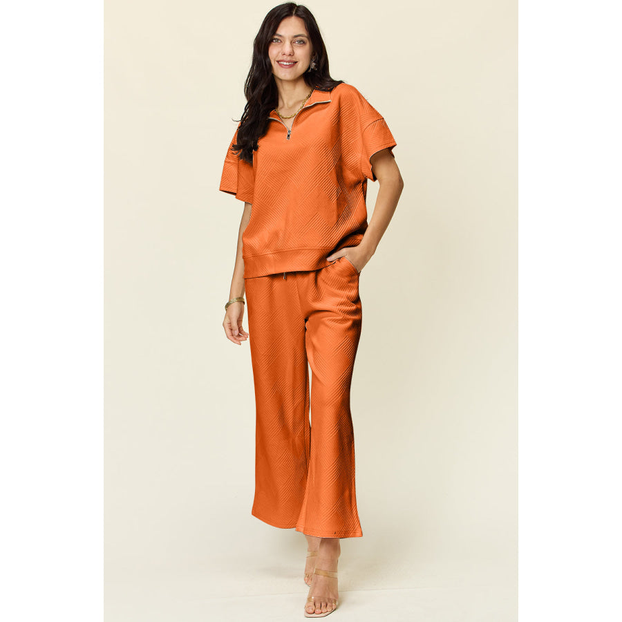 Double Take Full Size Texture Half Zip Short Sleeve Top and Pants Set