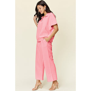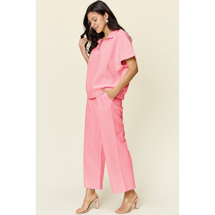 Double Take Full Size Texture Half Zip Short Sleeve Top and Pants Set