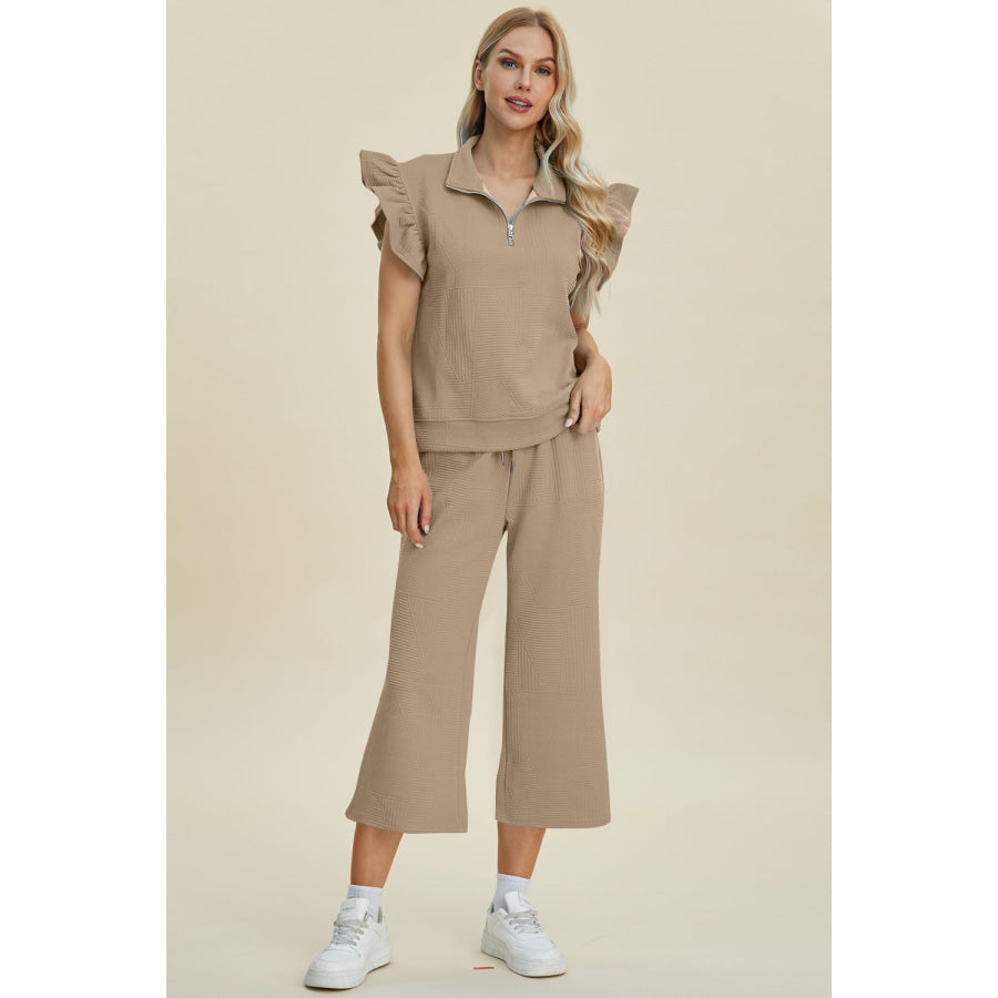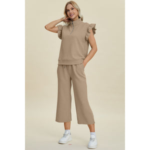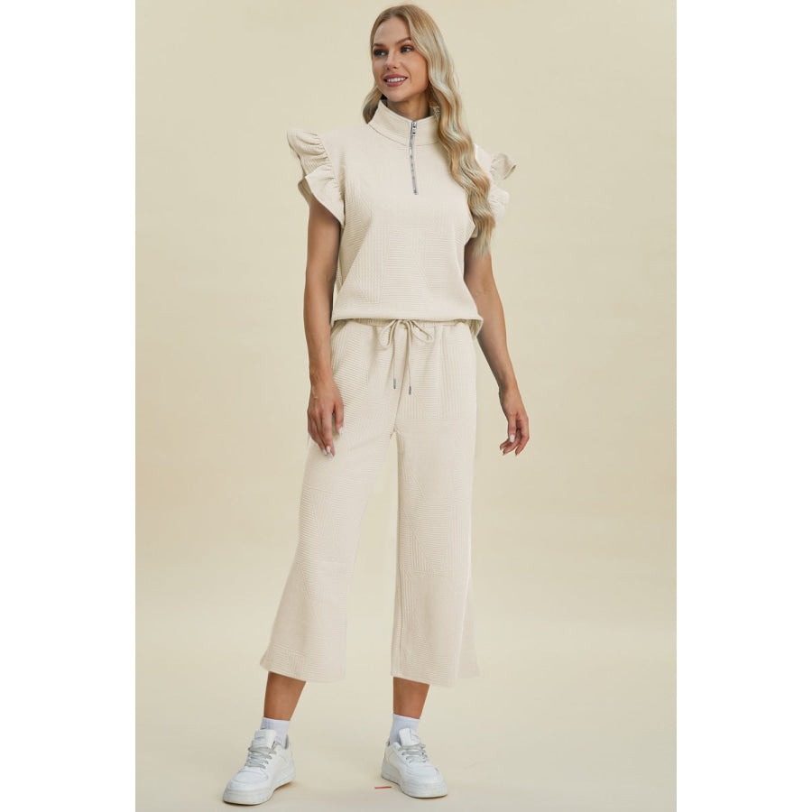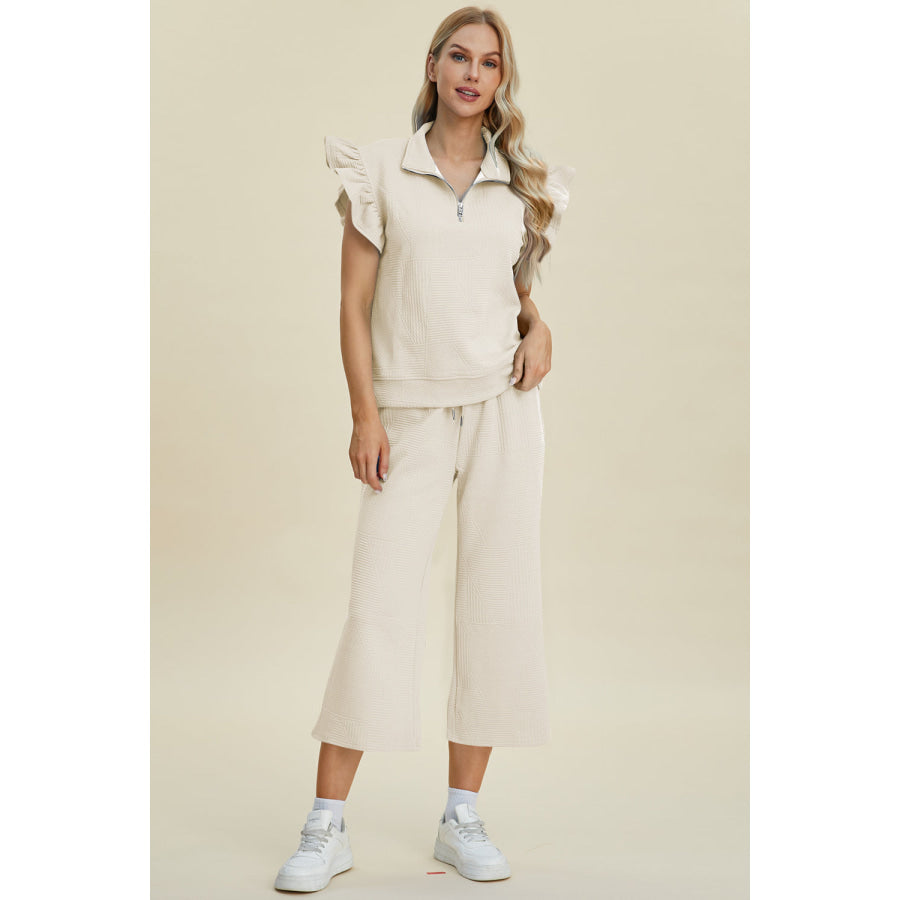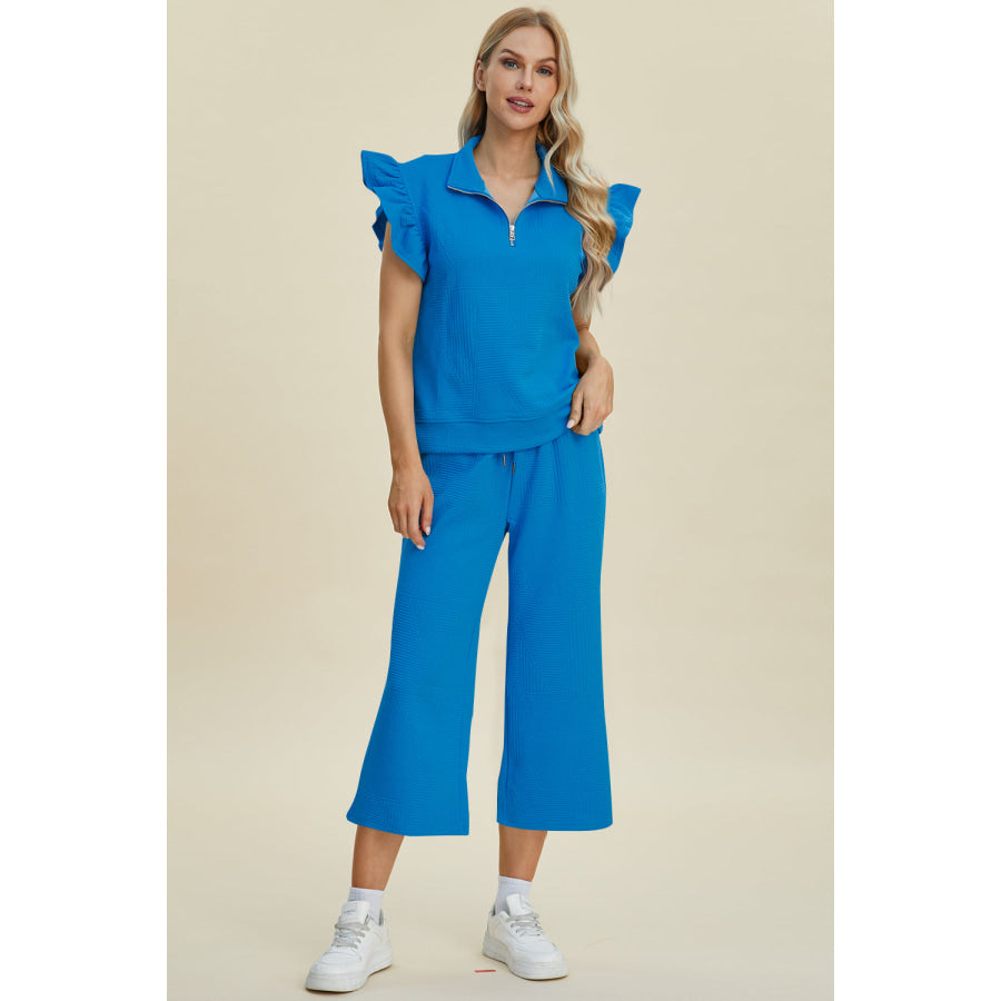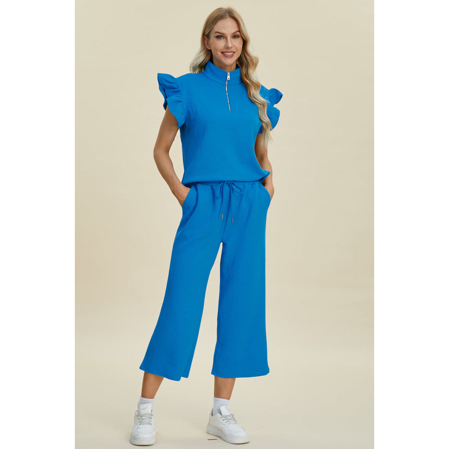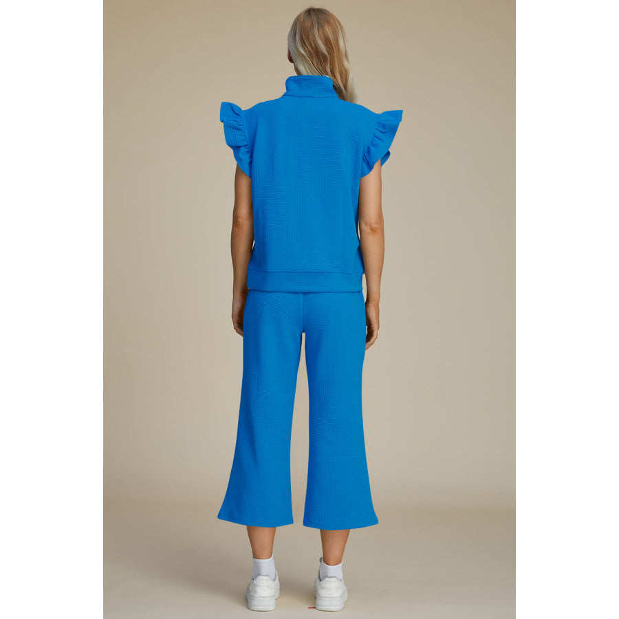 Double Take Full Size Texture Ruffle Short Sleeve Top and Wide Leg Pants Set