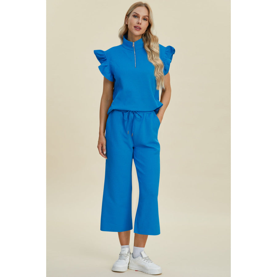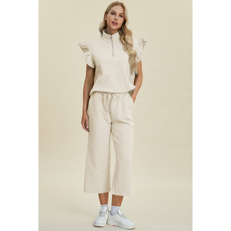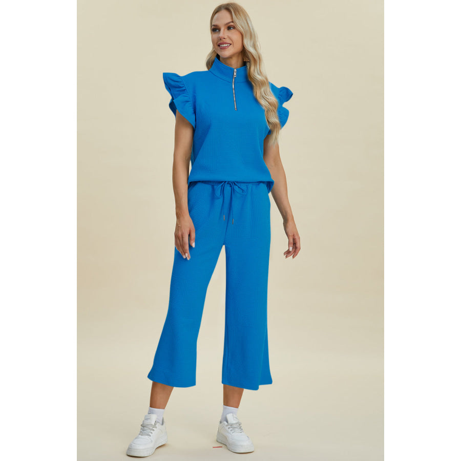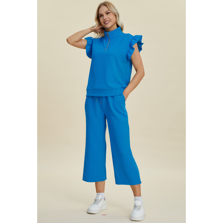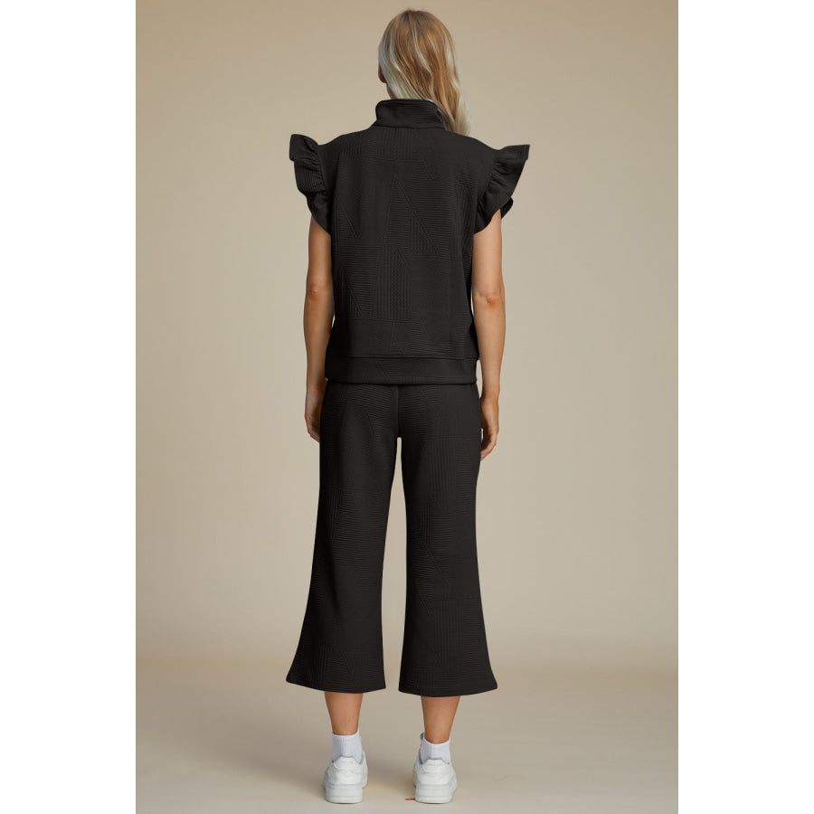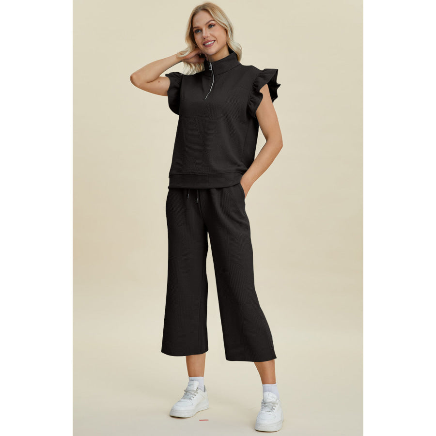 Double Take Full Size Texture Ruffle Short Sleeve Top and Wide Leg Pants Set