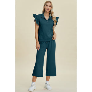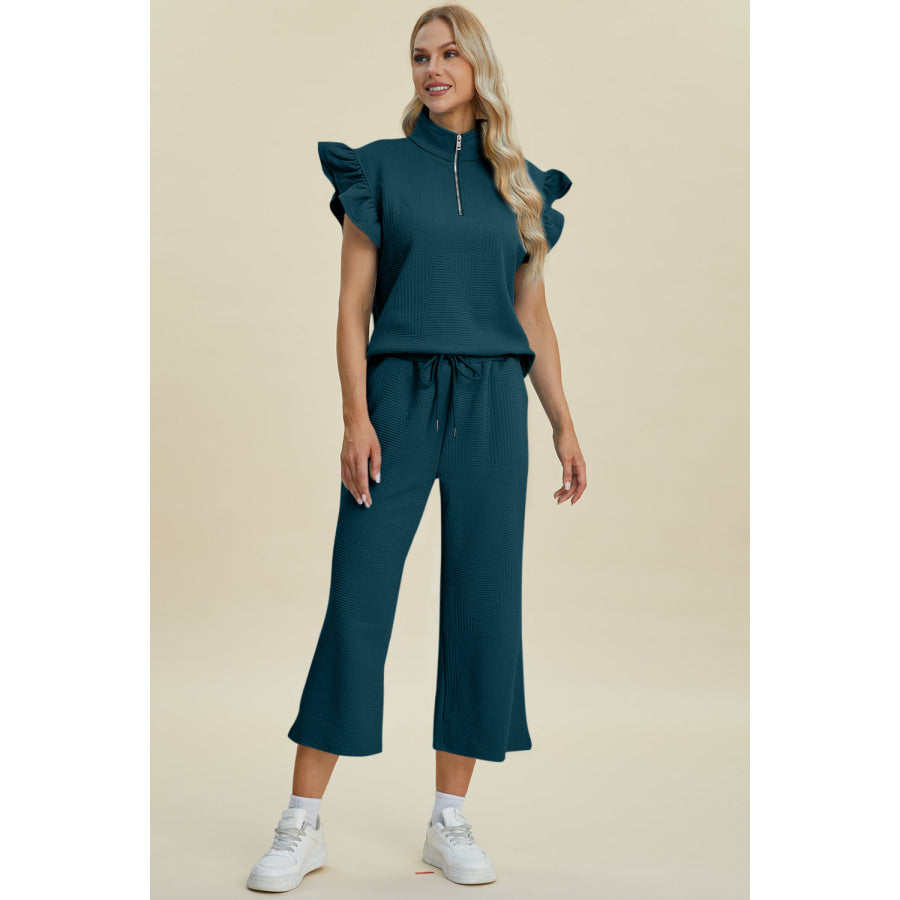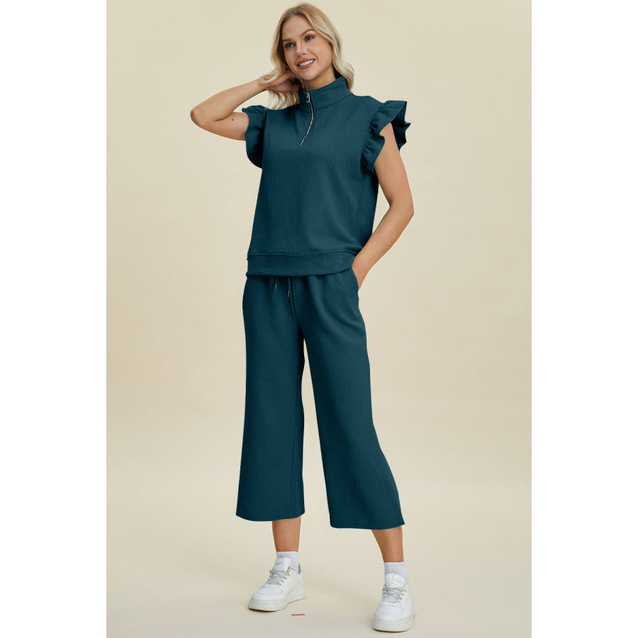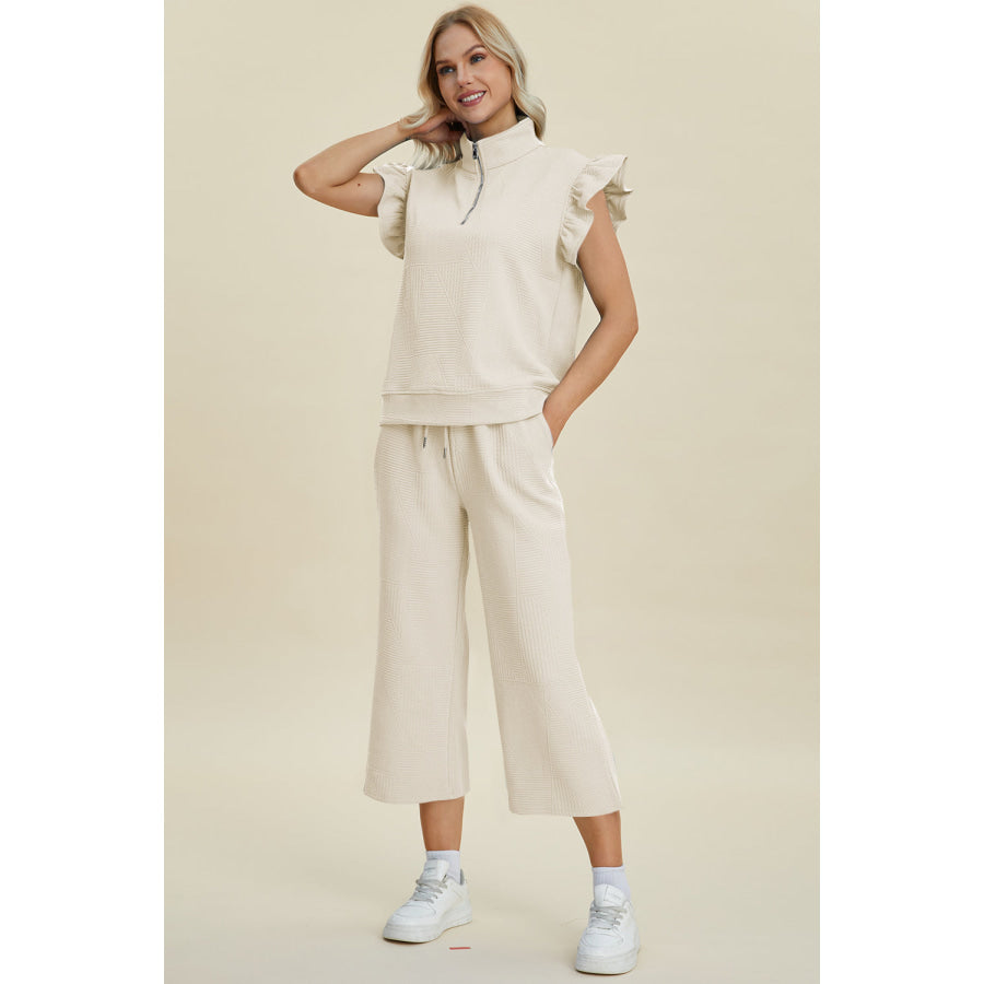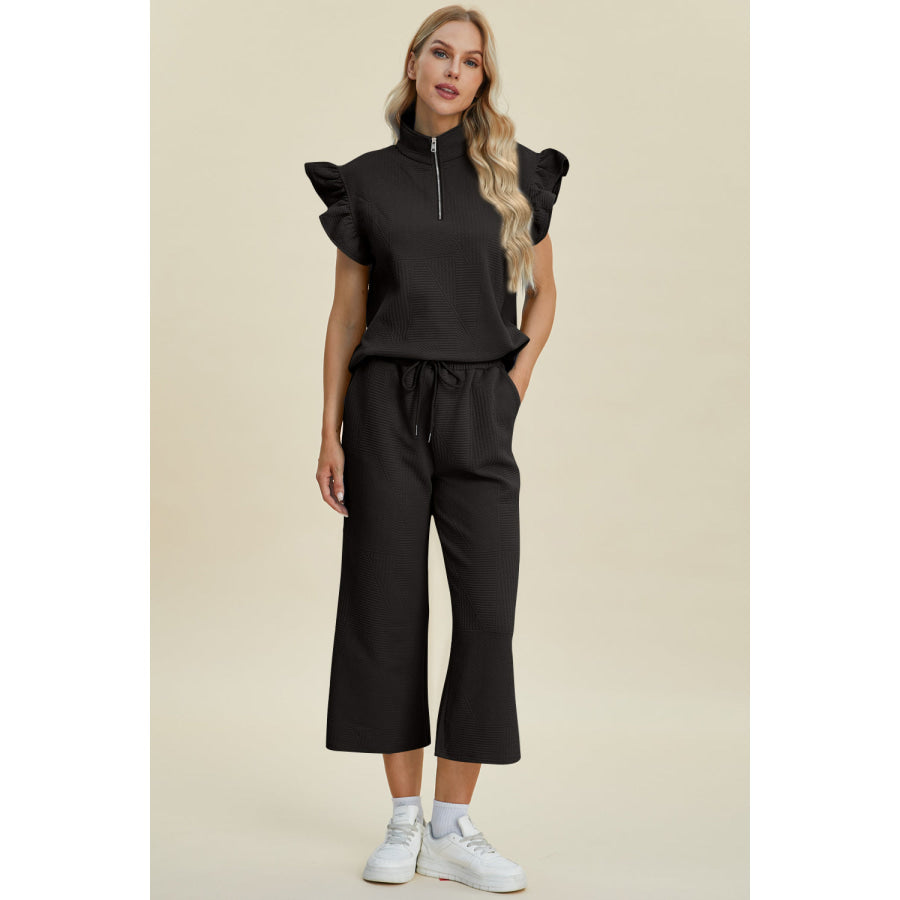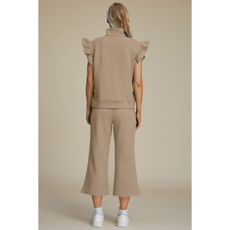 Double Take Full Size Texture Ruffle Short Sleeve Top and Wide Leg Pants Set
