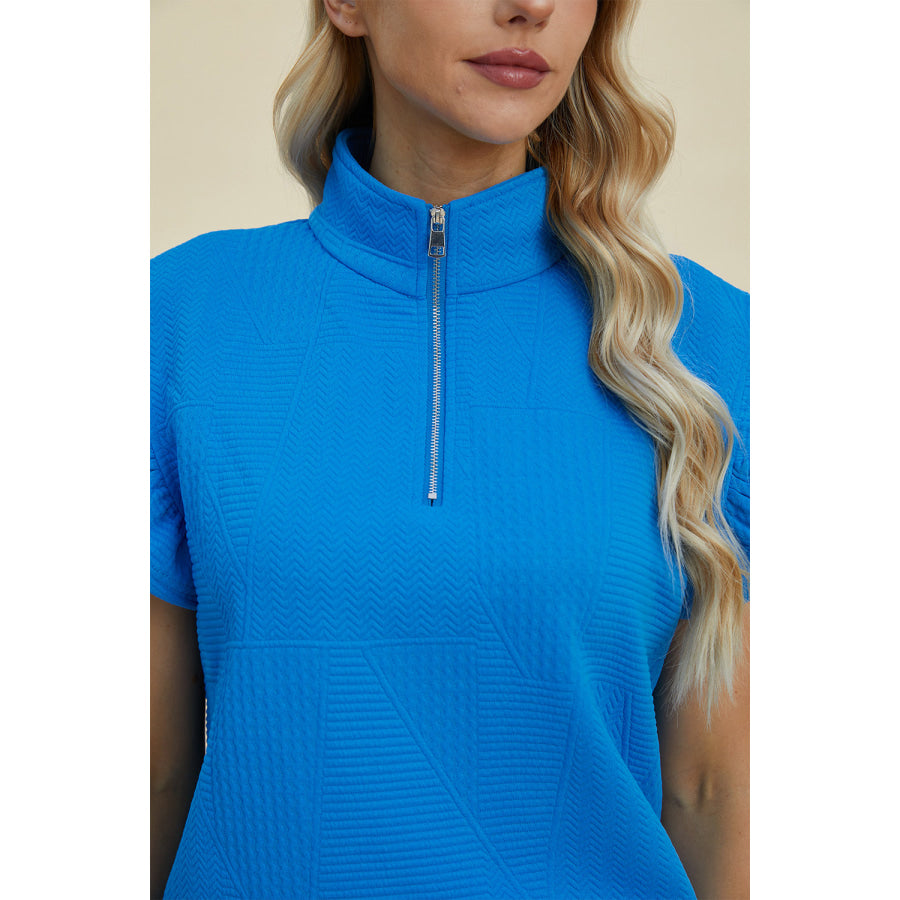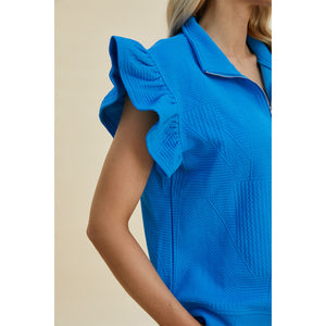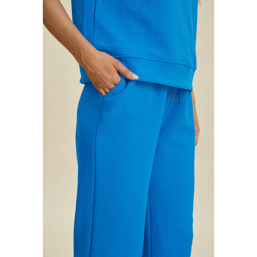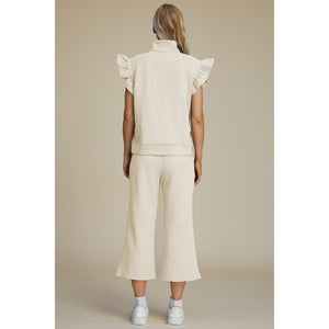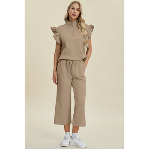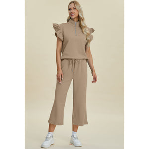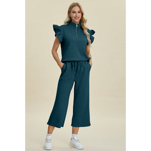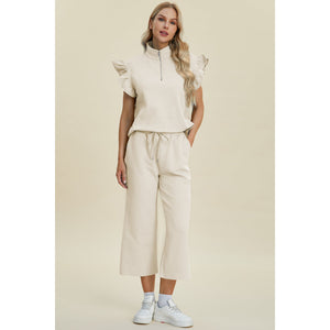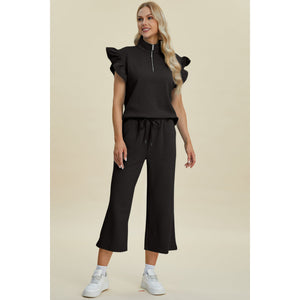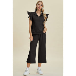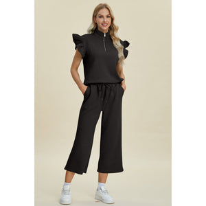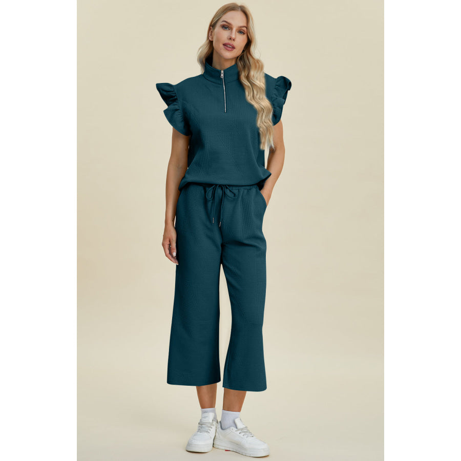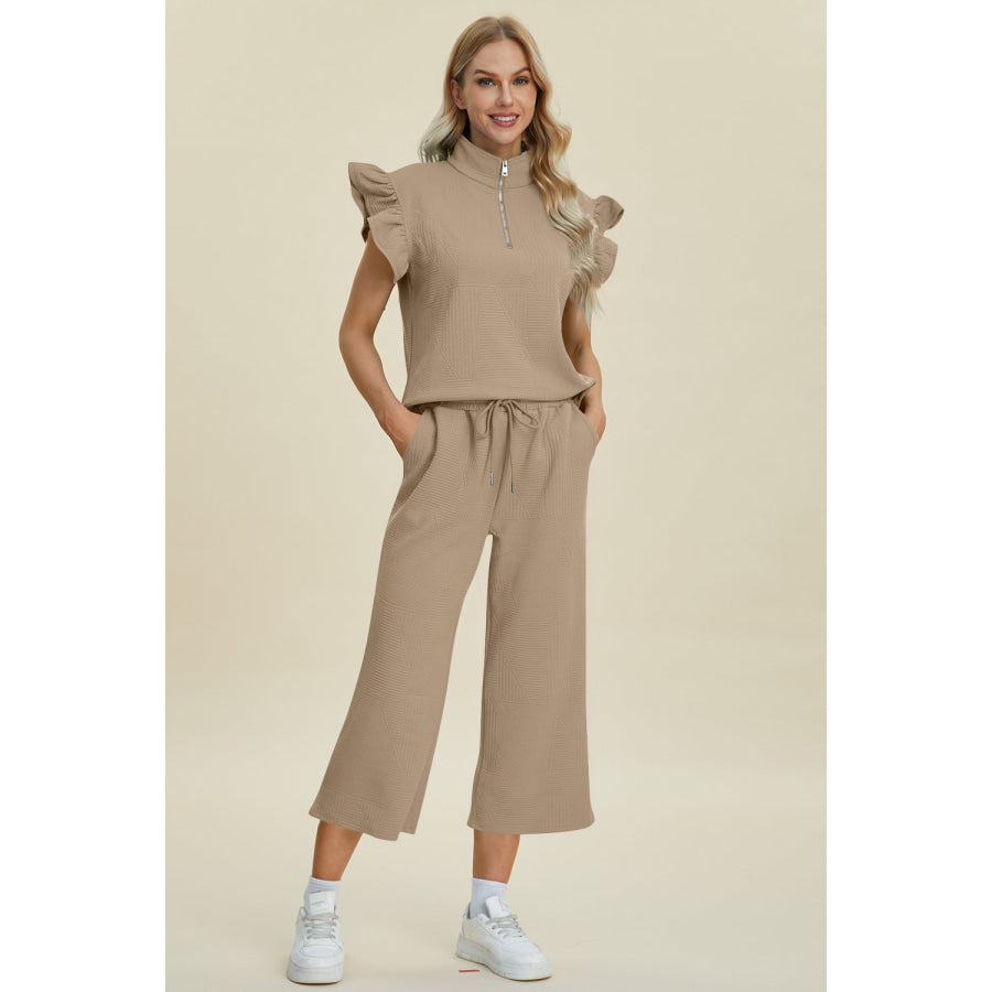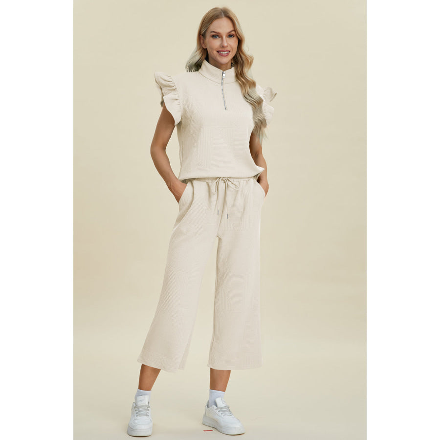 Double Take Full Size Texture Ruffle Short Sleeve Top and Wide Leg Pants Set