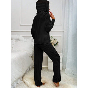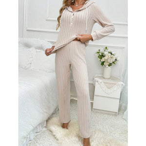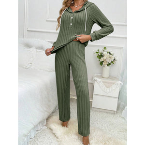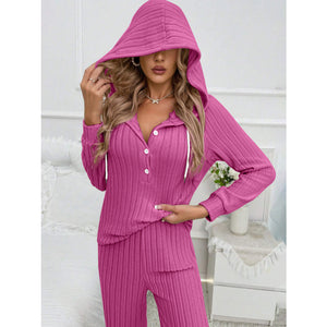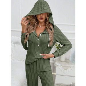 Drawstring Half Button Hooded Top and Ribbed Pants Set