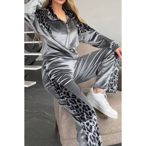 Full Size Collared Neck Leopard Zip Up Top and Pants Set Plus Size