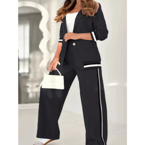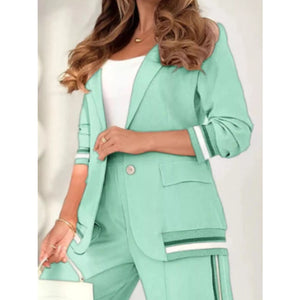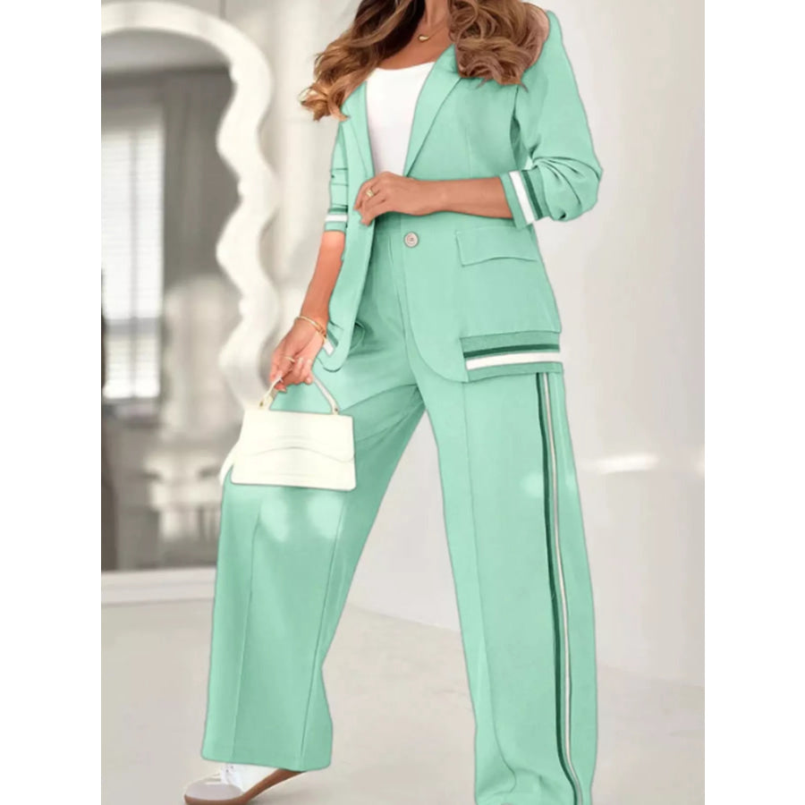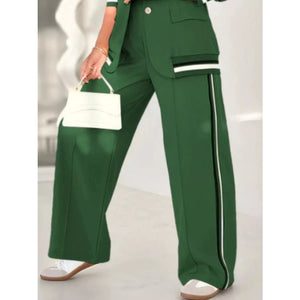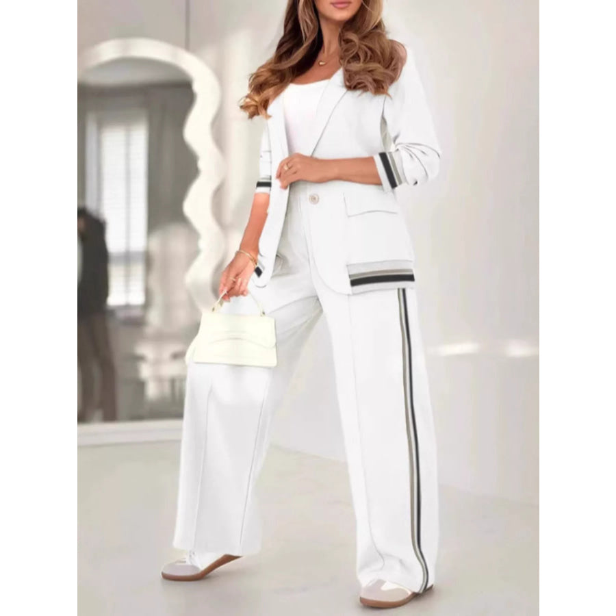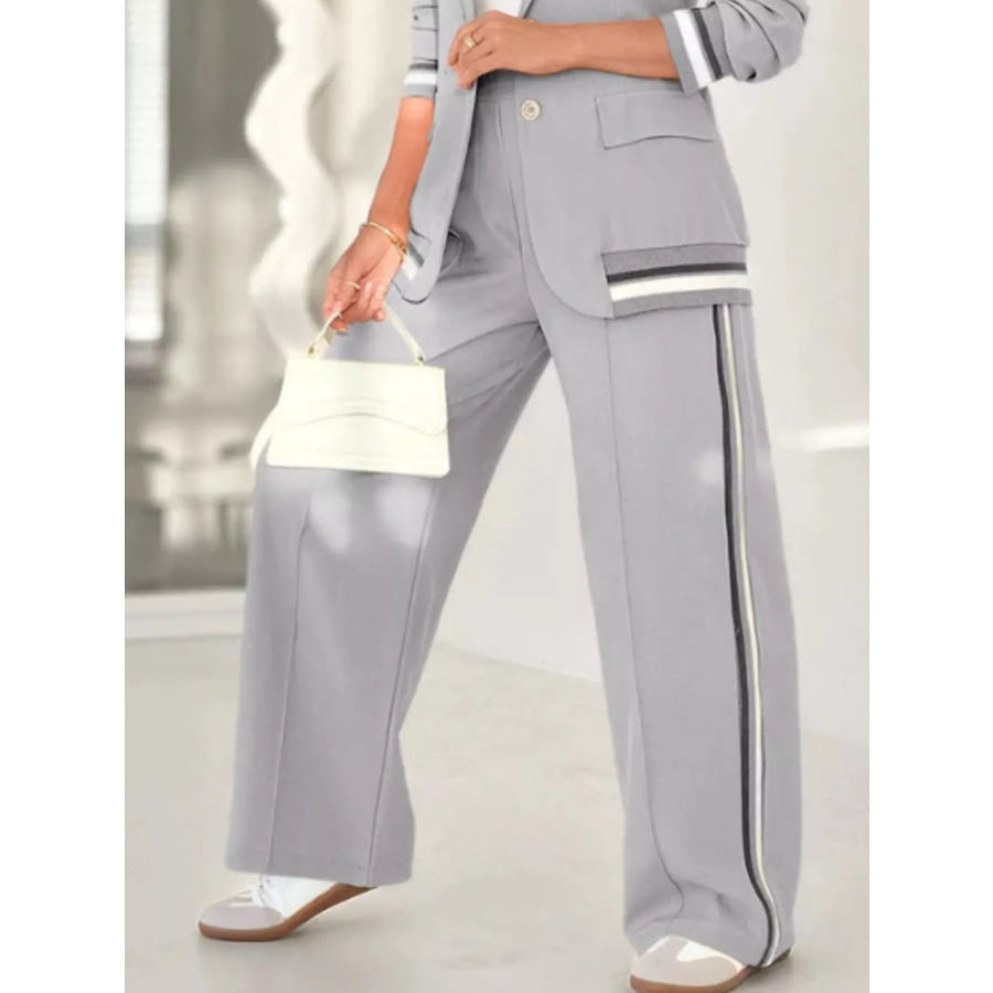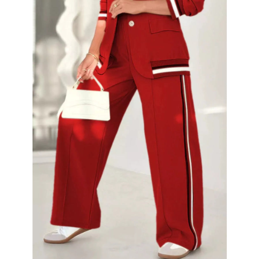 Full Size Striped Trim Button Down Jacket and Pants Set Plus Size