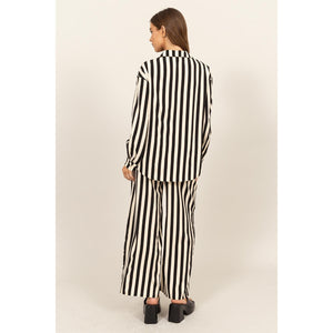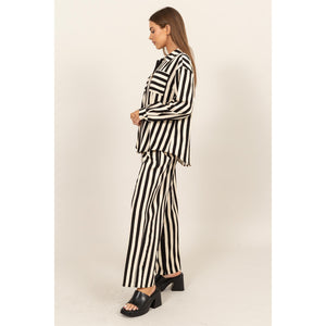 Make a bold fashion statement with this striped button-up set. The set includes a long-sleeve button-up shirt and matching wide-leg pants, both featuring striking vertical stripes that exude modern sophistication. The shirt comes with a classic collared neckline, buttoned cuffs, and front chest pockets, adding both functionality and style. The wide-leg pants offer a relaxed fit with a comfortable waistband, making them perfect for all-day wear. Whether you wear them together for a cohesive look or mix and match them with other pieces, this set is sure to elevate your wardrobe with its chic and elegant design.