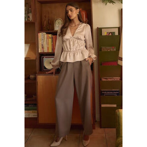 Inverted pleat detail wide leg pants are pants that feature pleats that are folded in the opposite direction of traditional pleats, creating a unique and stylish design detail. The wide leg cut of the pants adds a flowy and relaxed silhouette, making them comfortable and fashionable for various occasions. These pants are versatile and can be paired with a variety of tops for a chic and sophisticated look.