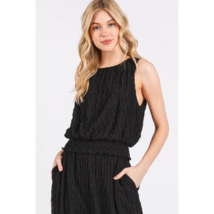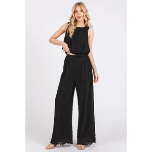 The Textured Stretchy Crop Tank and Pants Set is a stylish and comfortable ensemble for various occasions. Made from textured stretchy fabric, this set offers a flattering and flexible fit. The crop tank top adds a trendy touch, while the matching pants provide a chic and coordinated look. Wear this set with sneakers for a casual vibe, or dress it up with heels for a more polished outfit.