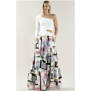 Custom print with low elastic waist, high pockets, flared full size palazzo pants.