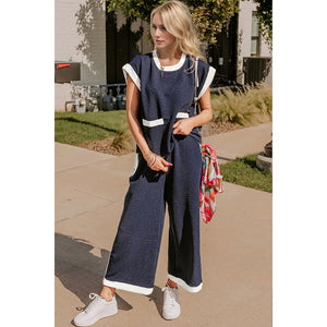 OH Texture Contrast Trim Round Neck Cap Sleeve Top and Pants Set