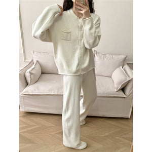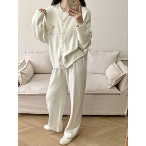 Pocketed Round Neck Button Up Cardigan and Pants Sweater Set