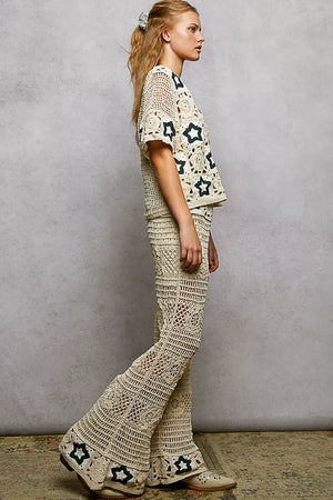This regular fit crochet bottom features a mix of intricate stitch patterns that give it a unique and stylish look. The contrast star motifs add a playful touch to the design, making it stand out even more. The flared hem detail adds movement and flow to the piece, creating a flattering silhouette. Overall, this bottom is both trendy and versatile, perfect for adding a touch of bohemian flair to your wardrobe. Pair it with a simple top to let the crochet details shine!