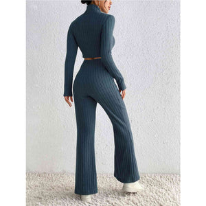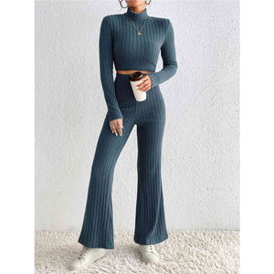 Ribbed Mock Neck Cropped Sweater & High Waist Pants Set