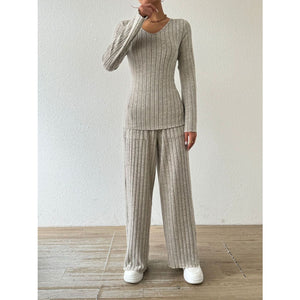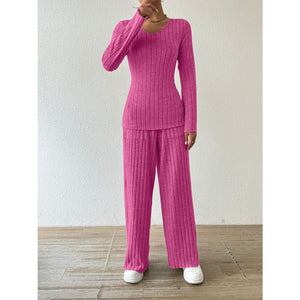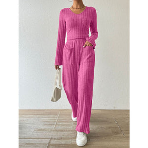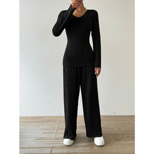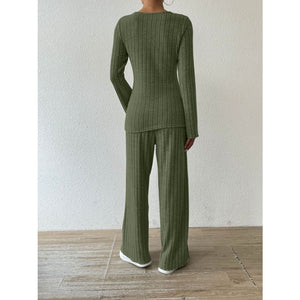 Ribbed V-Neck Long Sleeve Top and Pocketed Pants Set
