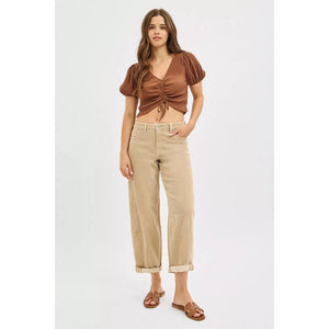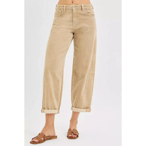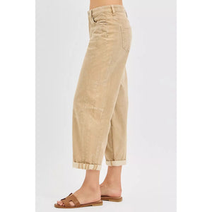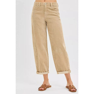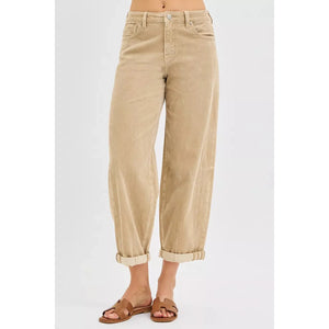 The high-rise crop barrel corduroy pants offer a stylish and retro-inspired addition to your wardrobe. The barrel cut provides a unique and flattering silhouette that is both modern and timeless. Made from corduroy fabric, these pants offer a soft and textured feel, perfect for colder seasons. The high-rise waist elongates the legs and creates a streamlined look. Pair these pants with boots and a sweater for a cozy and chic outfit that channels vintage vibes with a contemporary twist.