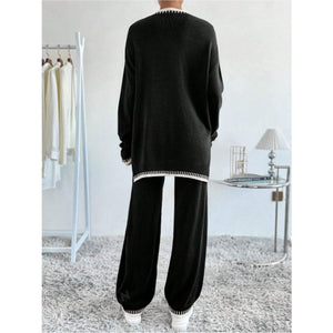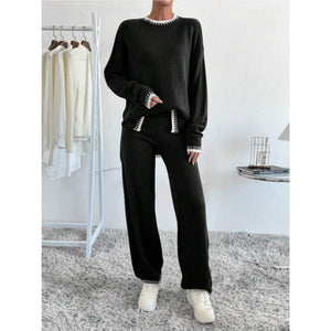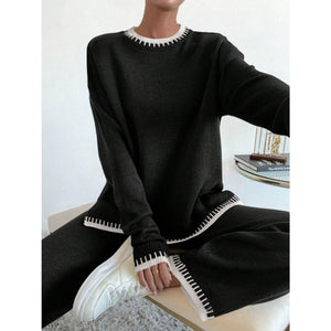Side Slit Contrast Trim Round Neck Top and Pants Sweater Set