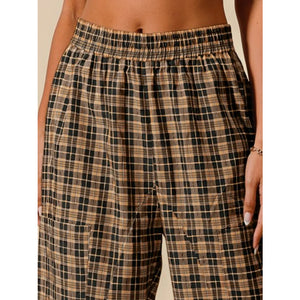 These check plaid wide leg pants feature big patch pockets and an elasticized waist for a comfortable and stylish fit. The check plaid pattern adds a classic touch to the trendy wide leg silhouette. Perfect for a chic and effortless look, these pants offer both style and functionality with their practical pockets and elasticized waistband. Elevate your outfit with these versatile and fashion-forward pants that are perfect for any occasion.
