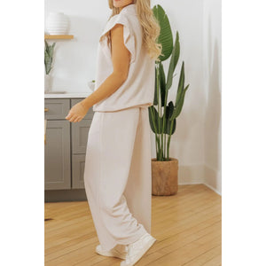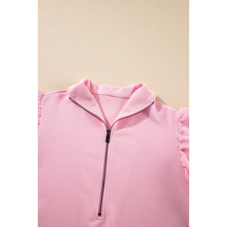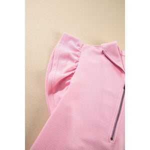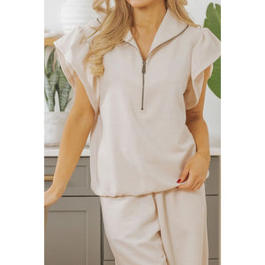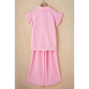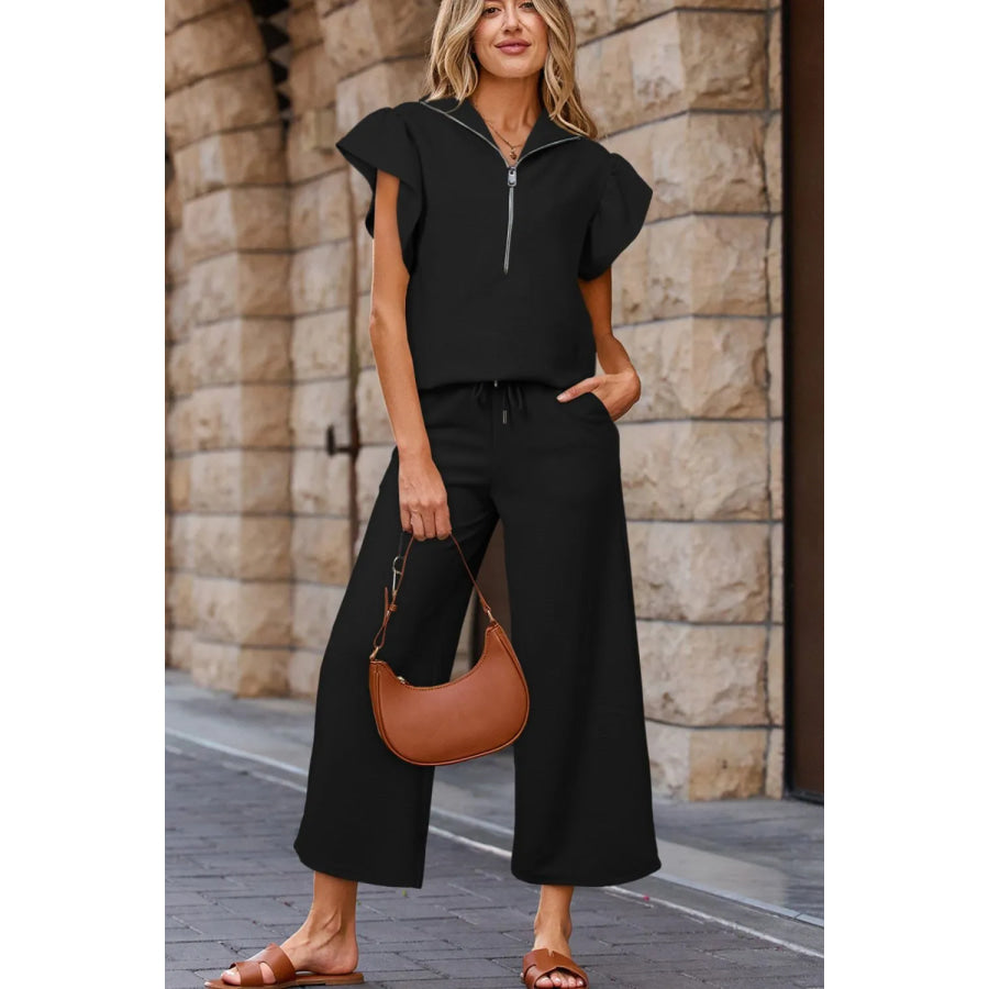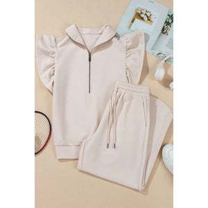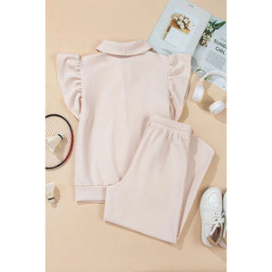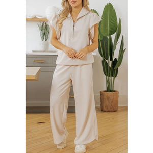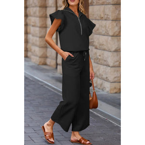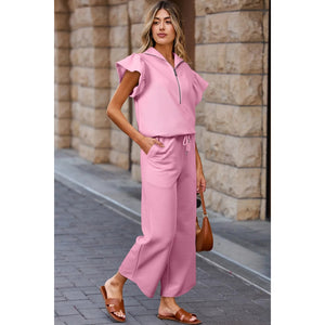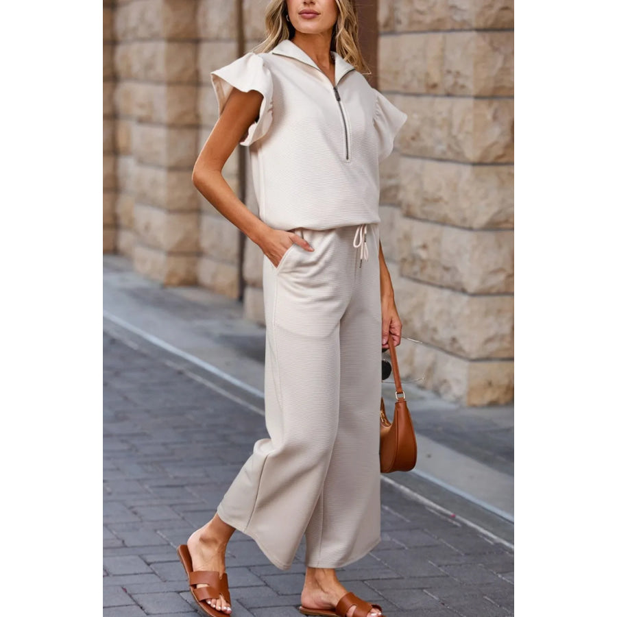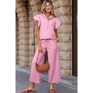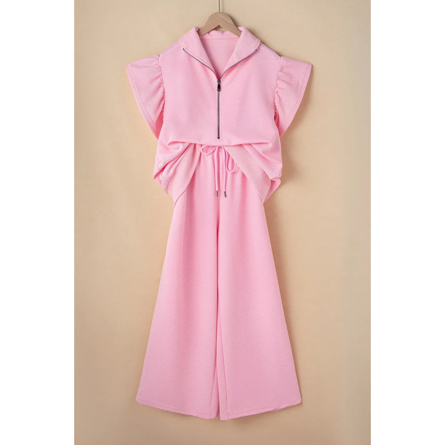 Textured Ruffled Sleeve Zipped Top and Wide Leg Pants Set