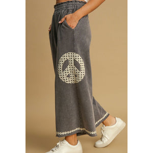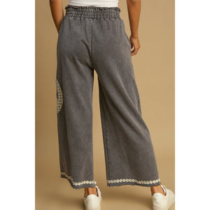 Umgee Full Size Peace Lace Applique Mineral Wash Wide Leg Pants Plus Size