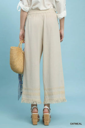 Umgee Lace Trim Fringe Hem Wide Leg Pants