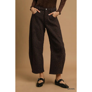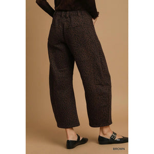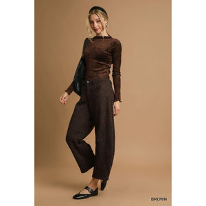 Make a statement with these leopard print wide leg pants. The bold print adds a touch of fierceness to the trendy wide leg silhouette, creating a chic and eye-catching look. Perfect for adding a pop of personality to your outfit, these pants are versatile and stylish. Elevate your wardrobe with these on-trend leopard print pants that will turn heads wherever you go.