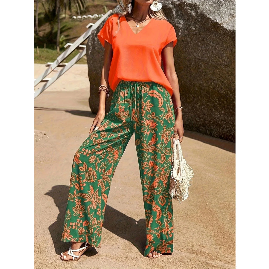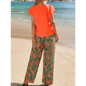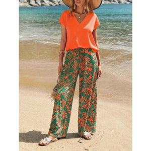 V-Neck Top and Summer Beach Floral Print Pants Two-Piece Set