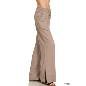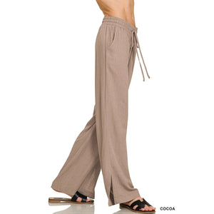 These casual wide leg pants feature a comfortable elastic waistband with adjustable drawstring closure, crafted from soft breathable fabric in a versatile taupe color. The relaxed wide leg silhouette provides ultimate comfort and freedom of movement, making them perfect for casual wear, lounging, or everyday activities. The full length design and loose fit offer a flattering and comfortable wearing experience suitable for various body types.